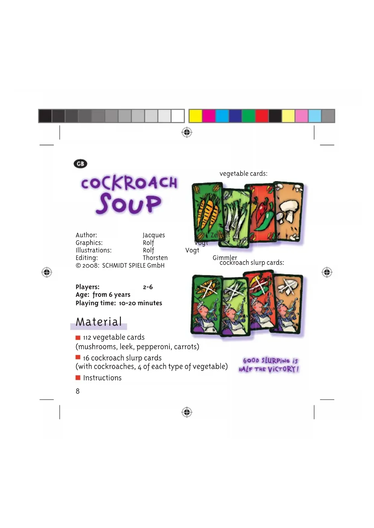 There are four cards of each type of vegetable which in addition show a slurping cockroach. If a player discards a cockroach slurp card, he/she must slurp. From this point on, every card which shows the ve- getable shown on the slurp card invokes the duty to slurp! This means that this vegetable must no longer be named. Look out! The player must not repeat slurping if the relevant vegetable or a new slurp card is discharged. Whenever the last player already slurped, he/she must utter the appreciative sound „mmm“. However, this sound also must not be repeated. Therefore, slurping is followed by