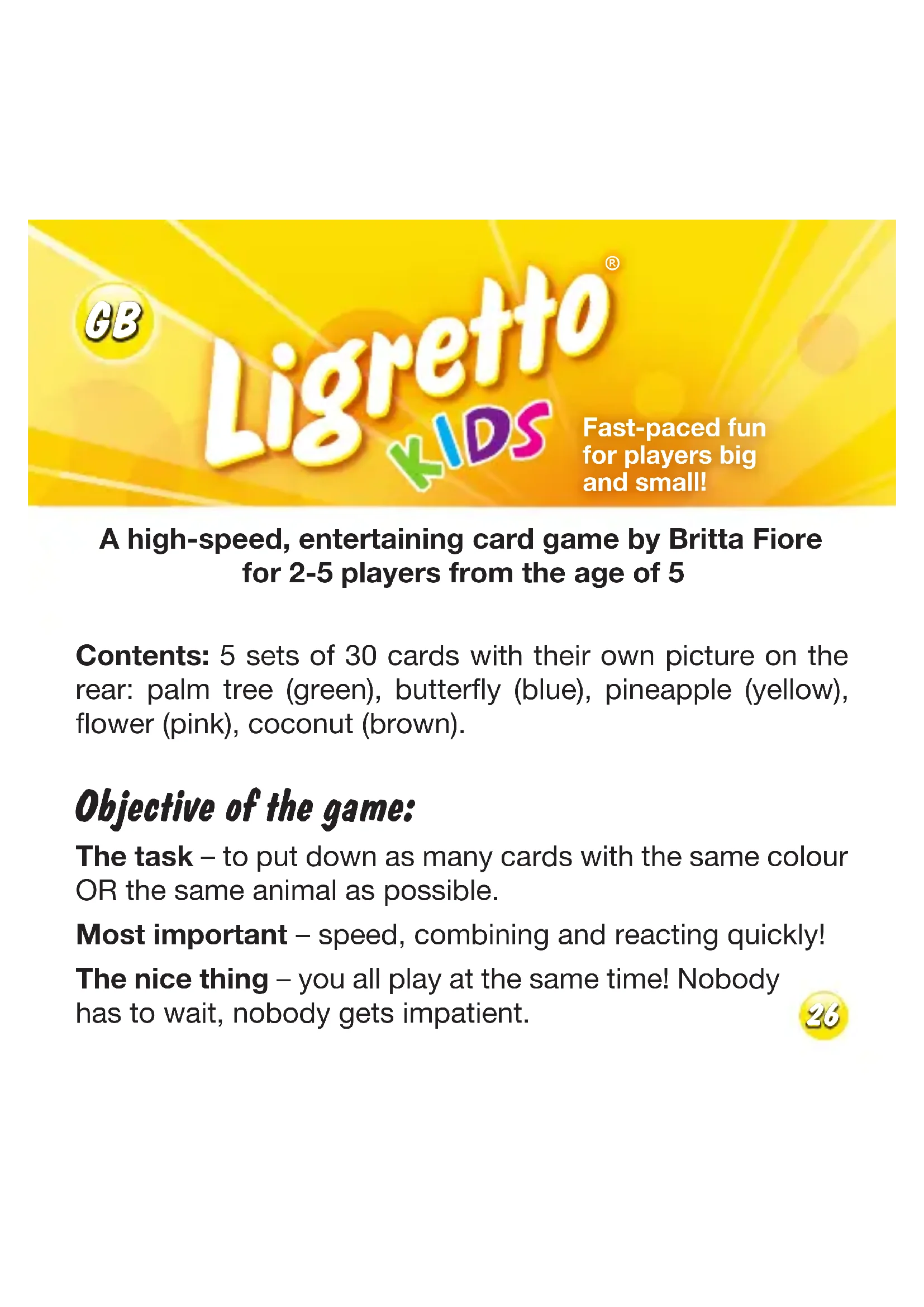 Fast-paced fun for players big and small! A high-speed, entertaining card game by Britta Fiore for 2-5 players from the age of 5 Contents: 5 sets of 30 cards with their own picture on the rear: palm tree (green), butterfly (blue), pineapple (yellow), flower (pink), coconut (brown). Objective of the game: The task – to put down as many cards with the same colour OR the same animal as possible. Most important – speed, combining and reacting quickly! The nice thing – you all play at the same time! Nobody has to wait, nobody gets impatient. 26Preparing to play: Sort the cards out into 5 sets of cards according to the rear of the cards (palm tree, butterfly, pineapple, flower, coconut). Each player receives one set of 30 cards. You keep this set of cards until the end of the game. If there are fewer than 5 players, the rest of the sets of cards are taken out of the game. Shuffle your pile of cards well. Then pick up the pile of the cards with the rear of the card face up (your so-called hand) and place the top card face up in the middle of the table. The cards in the middle of the table are the starting cards of your pile (2 cards for 2 players, 3 cards for 3 players, etc.). Any player can put down cards on any of these piles! Tip: alternatively, instead of holding the hand of cards, you can put them down on the table and turn them over and put them down from there. 27How to play: One of you gives the starting signal “Ligretto!” Now, at the same time, you all try to get rid of your cards as quickly as possible by turning over each card one by one and, if possible, putting it down on the correct pile in the middle. The following applies when you are putting down the cards: