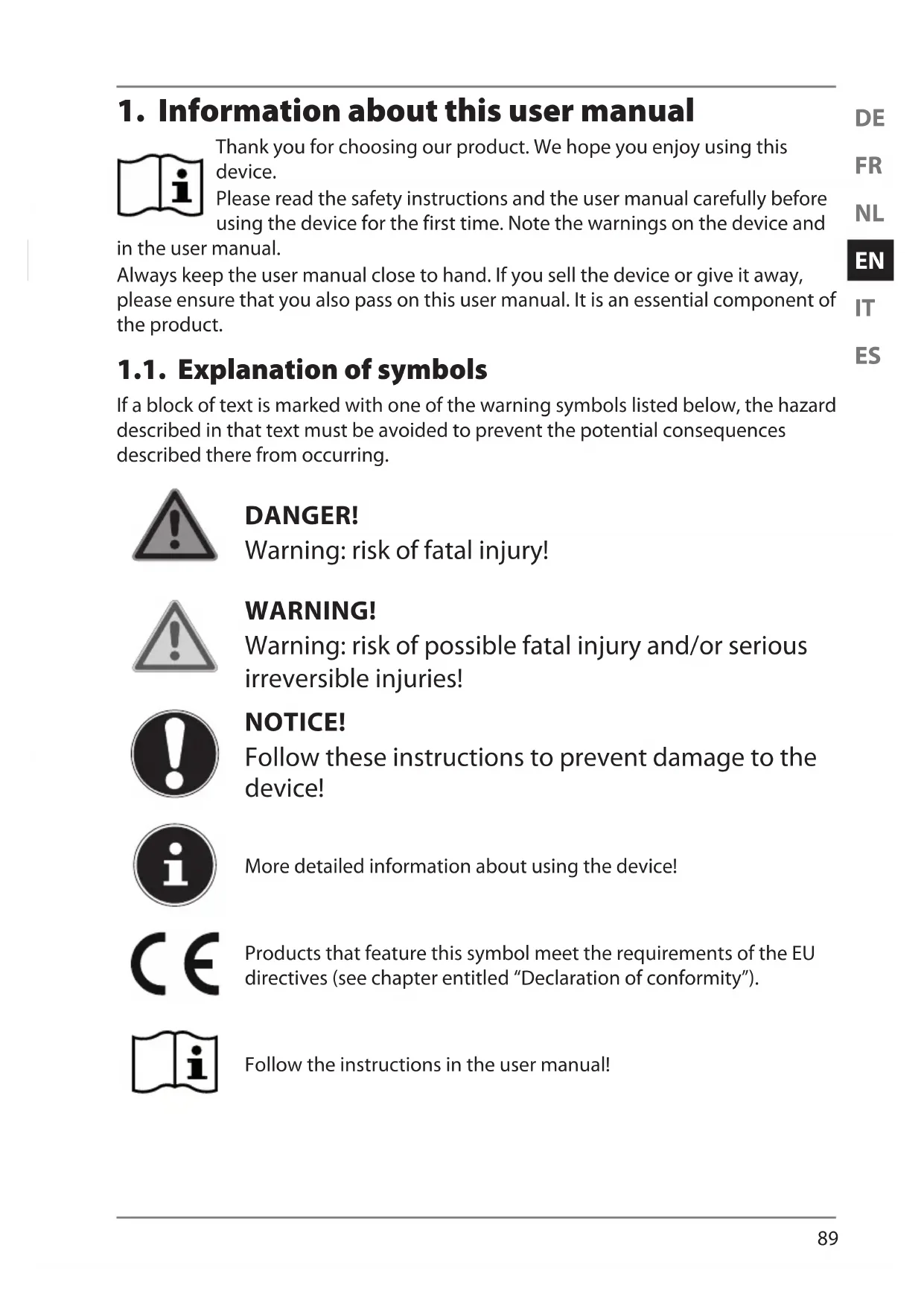 Thank you for choosing our product. We hope you enjoy using this device. Please read the safety instructions and the user manual carefully before using the device for the first time. Note the warnings on the device and in the user manual. Always keep the user manual close to hand. If you sell the device or give it away, please ensure that you also pass on this user manual. It is an essential component of the product. 1.1. Explanation of symbols If a block of text is marked with one of the warning symbols listed below, the hazard described in that text must be avoided to prevent the potential consequences described there from occurring. DANGER!