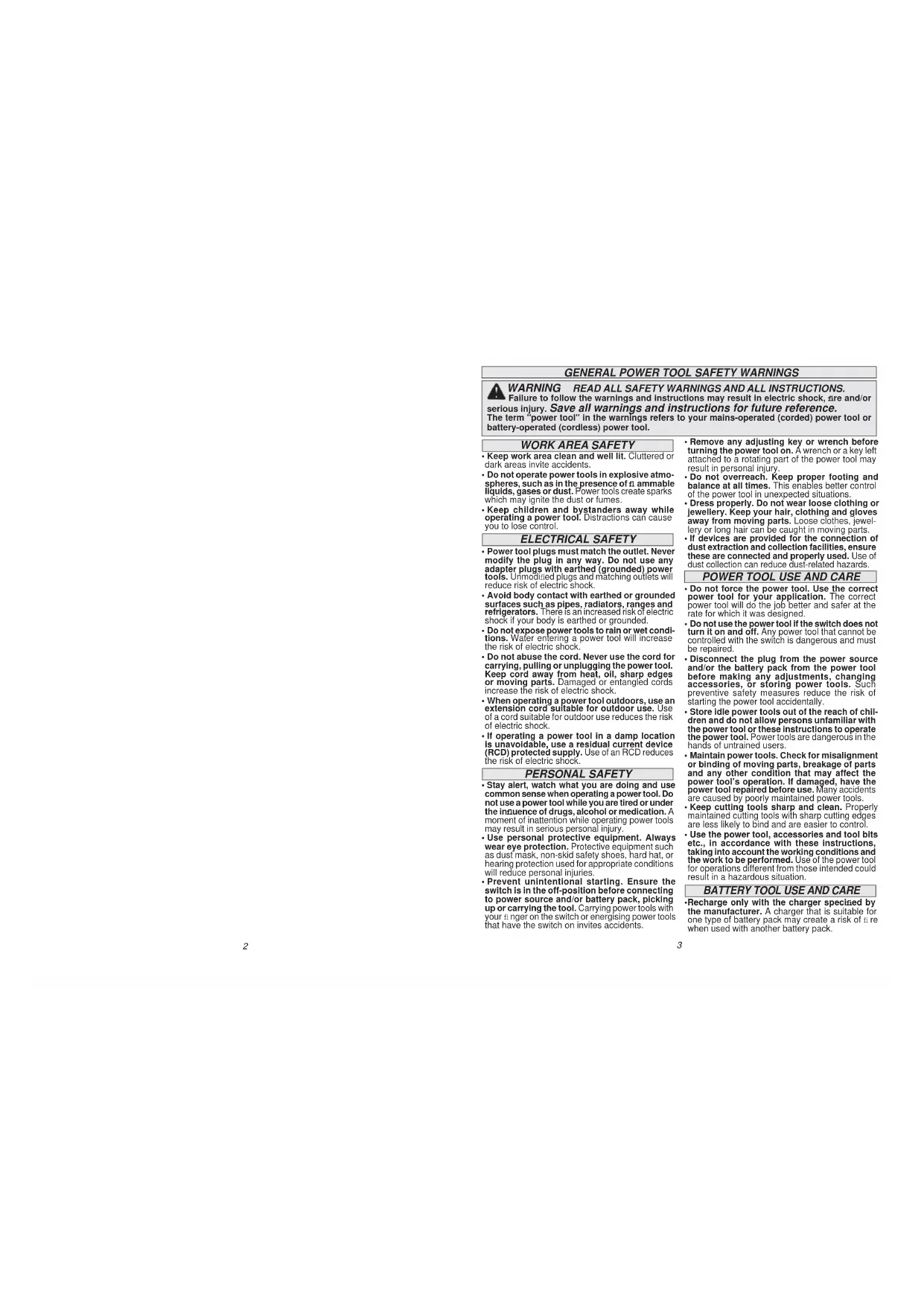 - If devices are provided for the connection of dust extraction and collection facilities, ensure these are connected and properly used. Use of dust collection can reduce dust-related hazards. WARNING READ ALL SAFETY WARNINGS AND ALL INSTRUCTIONS. Failure to follow the warnings and instructions may result in electric shock, fi re and/or serious injury. Save all warnings and instructions for future reference. The term "power tool" in the warnings refers to your mains-operated (corded) power tool or battery-operated (cordless) power tool.