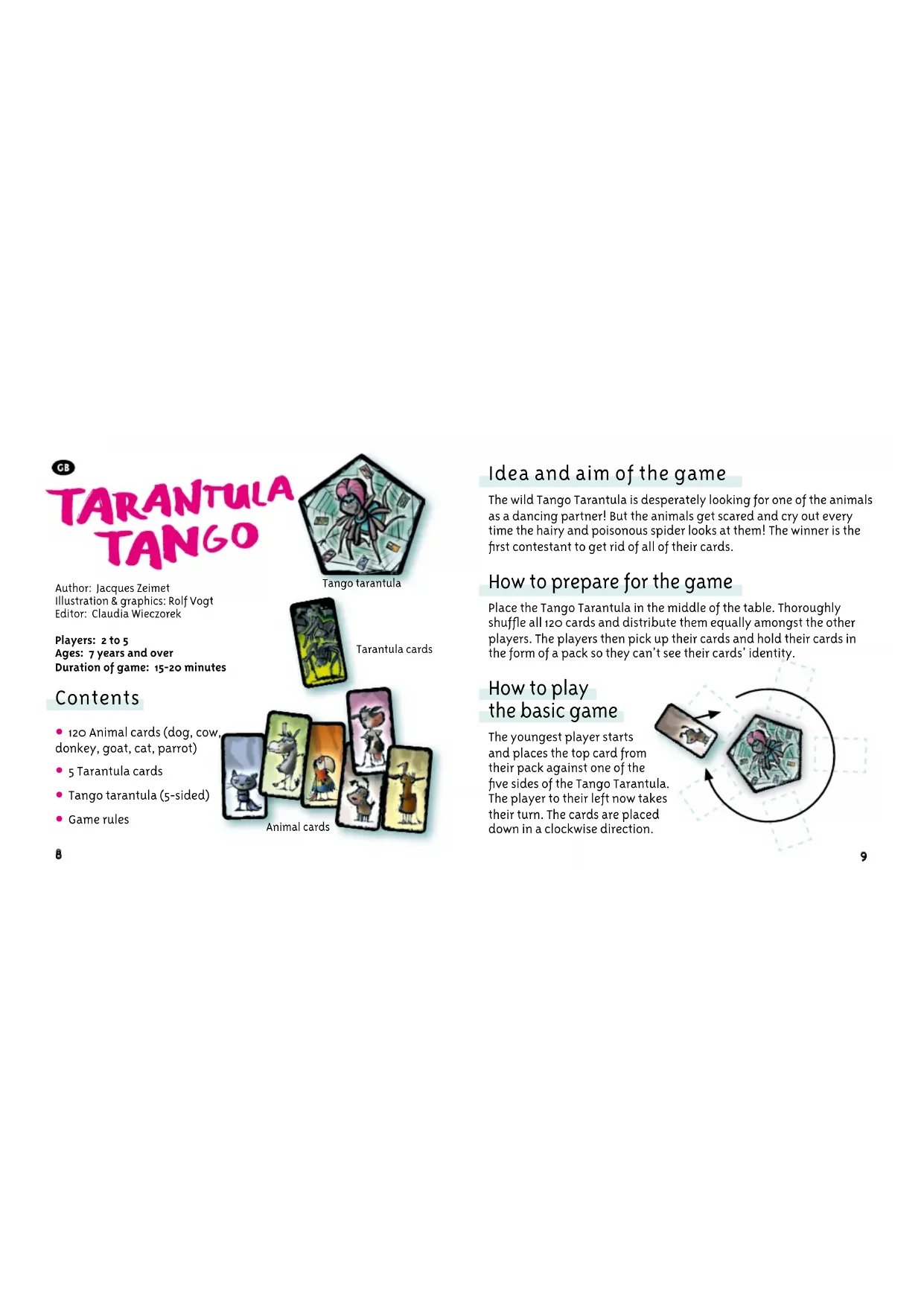 Idea and aim of the game The wild Tango Tarantula is desperately looking for one of the animals as a dancing partner! But the animals get scared and cry out every time the hairy and poisonous spider looks at them! The winner is the first contestant to get rid of all of their cards. How to prepare for the game Place the Tango Tarantula in the middle of the table. Thoroughly shuffle all 120 cards and distribute them equally amongst the other players. The players then pick up their cards and hold their cards in the form of a pack so they can’t see their cards’ identity. How to play the basic game The youngest player starts and places the top card from their pack against one of the five sides of the Tango Tarantula. The player to their left now takes their turn. The cards are placed down in a clockwise direction. Author: Jacques Zeimet Illustration & graphics: Rolf Vogt Editor: Claudia Wieczorek Players: 2 to 5 Ages: 7 years and over Duration of game: 15-20 minutes Contents