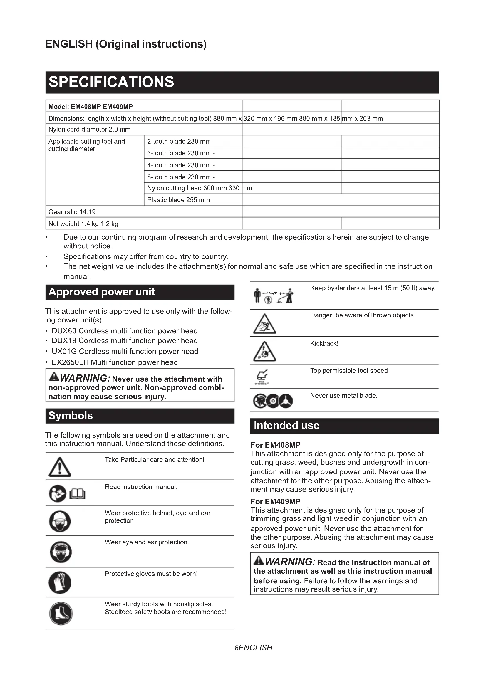 Keep bystanders at least 15 m (50 ft) away. Danger;beawareofthrownobjects. Kickback! Top permissible tool speed Never use metal blade. Intended use For EM408MP This attachment is designed only for the purpose of cutting grass, weed, bushes and undergrowth in con- junctionwithanapprovedpowerunit.Neverusethe attachment for the other purpose. Abusing the attach- mentmaycauseseriousinjury. For EM409MP This attachment is designed only for the purpose of trimminggrassandlightweedinconjunctionwithan approved power unit. Never use the attachment for the other purpose. Abusing the attachment may cause seriousinjury.