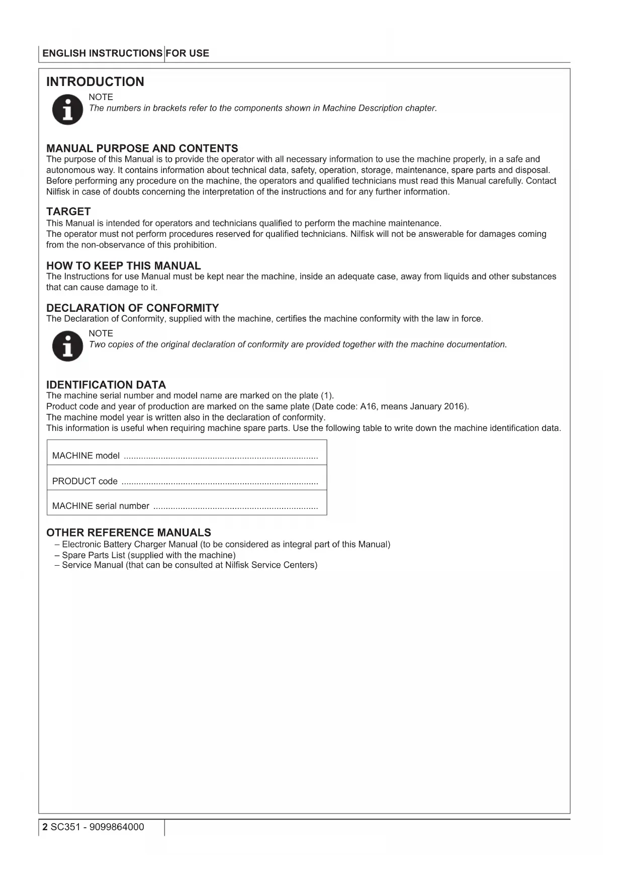 – Electronic Battery Charger Manual (to be considered as integral part of this Manual) – Spare Parts List (supplied with the machine) – Service Manual (that can be consulted at Nilsk Service Centers)INSTRUCTIONS FOR USE ENGLISH 9099864000 - SC351 3