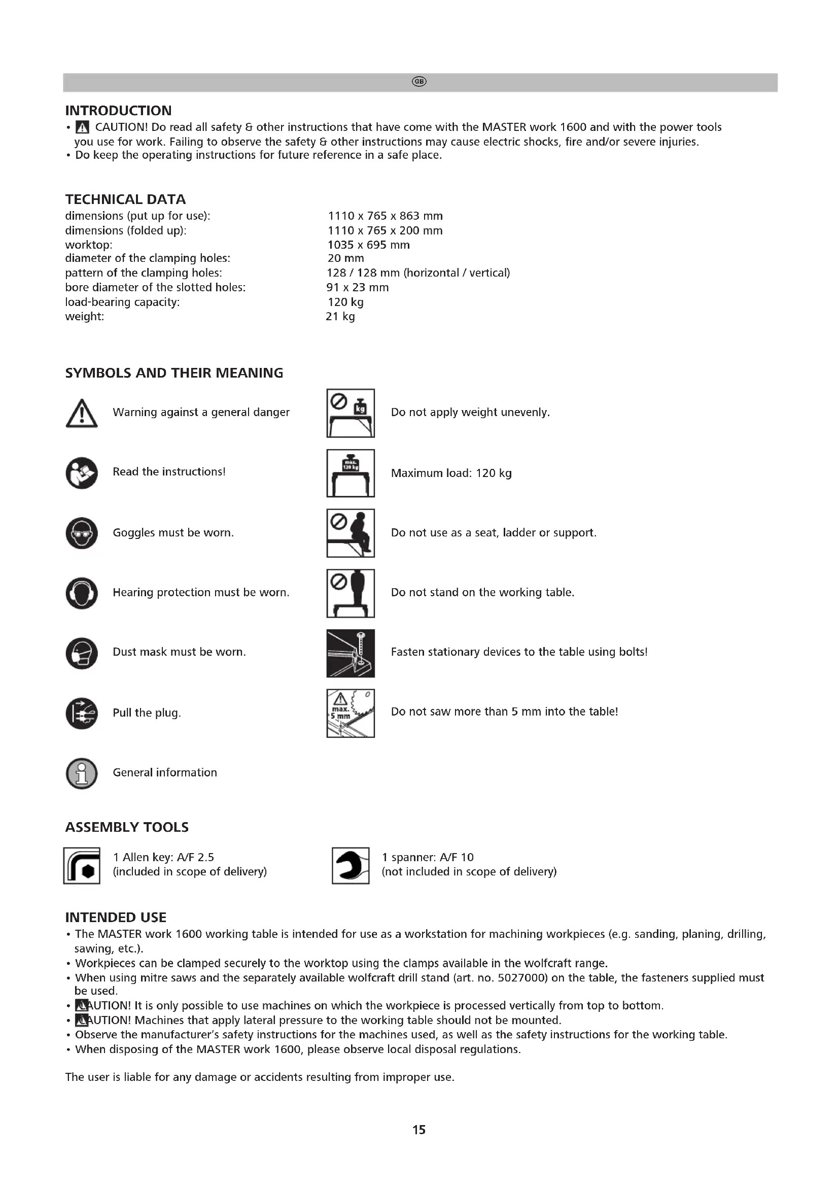Do not apply weight unevenly. Maximum load: 120 kg Do not use as a seat, ladder or support. Do not stand on the working table. Fasten stationary devices to the table using bolts! Do not saw more than 5 mm into the table! Warning against a general danger Read the instructions! Goggles must be worn. Hearing protection must be worn. Pull the plug. General information Dust mask must be worn. ASSEMBLY TOOLS 1 Allen key: A/F 2.5 (included in scope of delivery) INTENDED USE