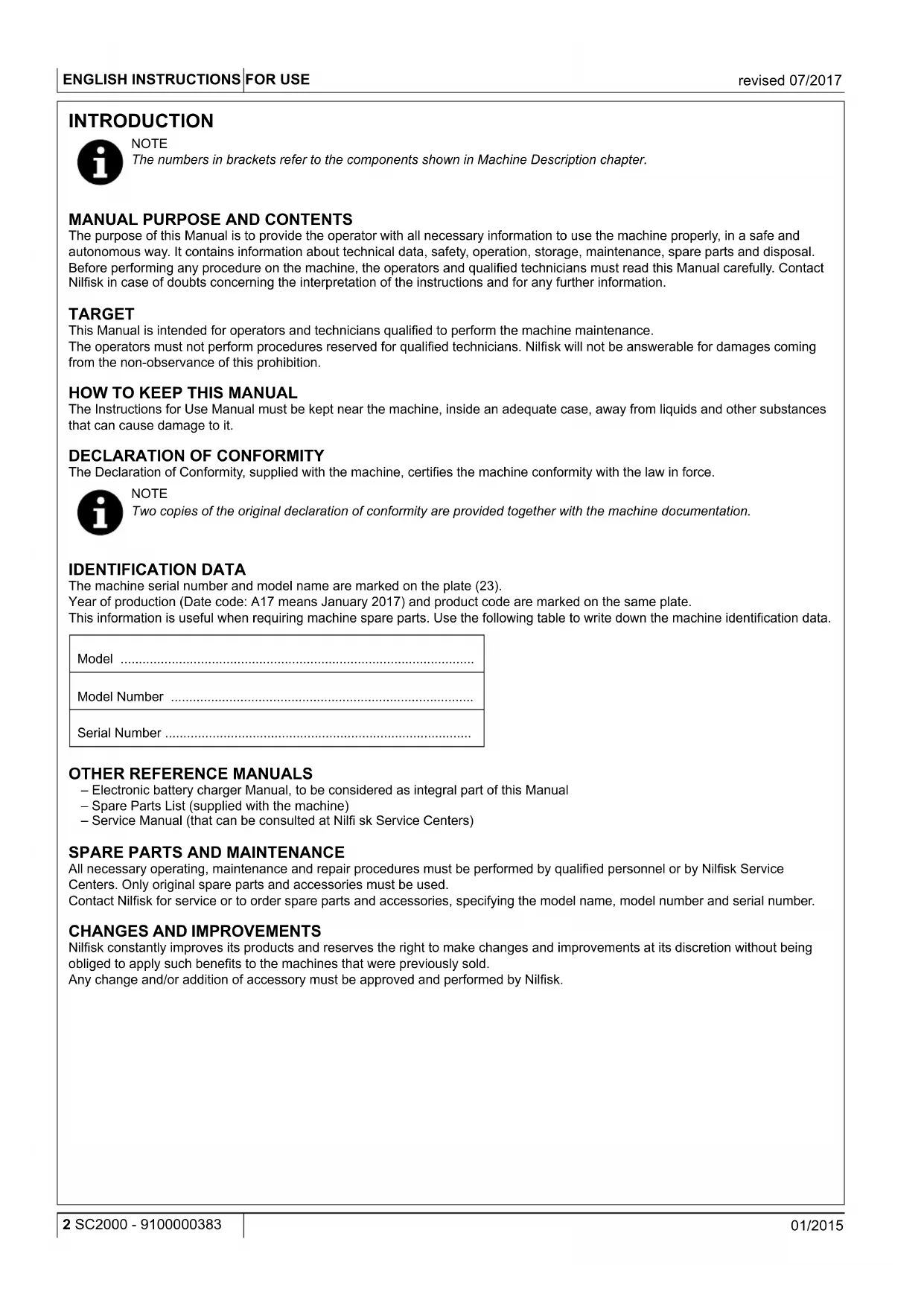 Nilfi sk constantly improves its products and reserves the right to make changes and improvements at its discretion without being obliged to apply such benefi ts to the machines that were previously sold. Any change and/or addition of accessory must be approved and performed by Nilfi sk.INSTRUCTIONS FOR USE ENGLISH 9100000383 - SC2000 3 01/2015 revised 07/2017 OPERATION CAPABILITIES The SC2000 scrubber-dryer is used to clean (scrubbing and drying) smooth and solid fl oors, in commercial or industrial environment, under safe operation conditions by a qualifi ed operator. The scrubber-dryer cannot be used for fi tted carpet and carpet cleaning. CONVENTIONS Forward, backward, front, rear, left or right are intended with reference to the operator on the driver’s seat, in the driving position (12). UNPACKING/DELIVERY To unpack the machine, carefully follow the instructions on the packing. To move the machine manually, see the Pushing/Towing The Machine paragraph. When the machine is delivered, check that the packing and the machine were not damaged during transportation. In case of visible damages, keep the packing and have it checked by the carrier that delivered it. Call the carrier immediately to fi ll in a damage claim. Please check that the following items have been supplied with the machine: – Technical documents: