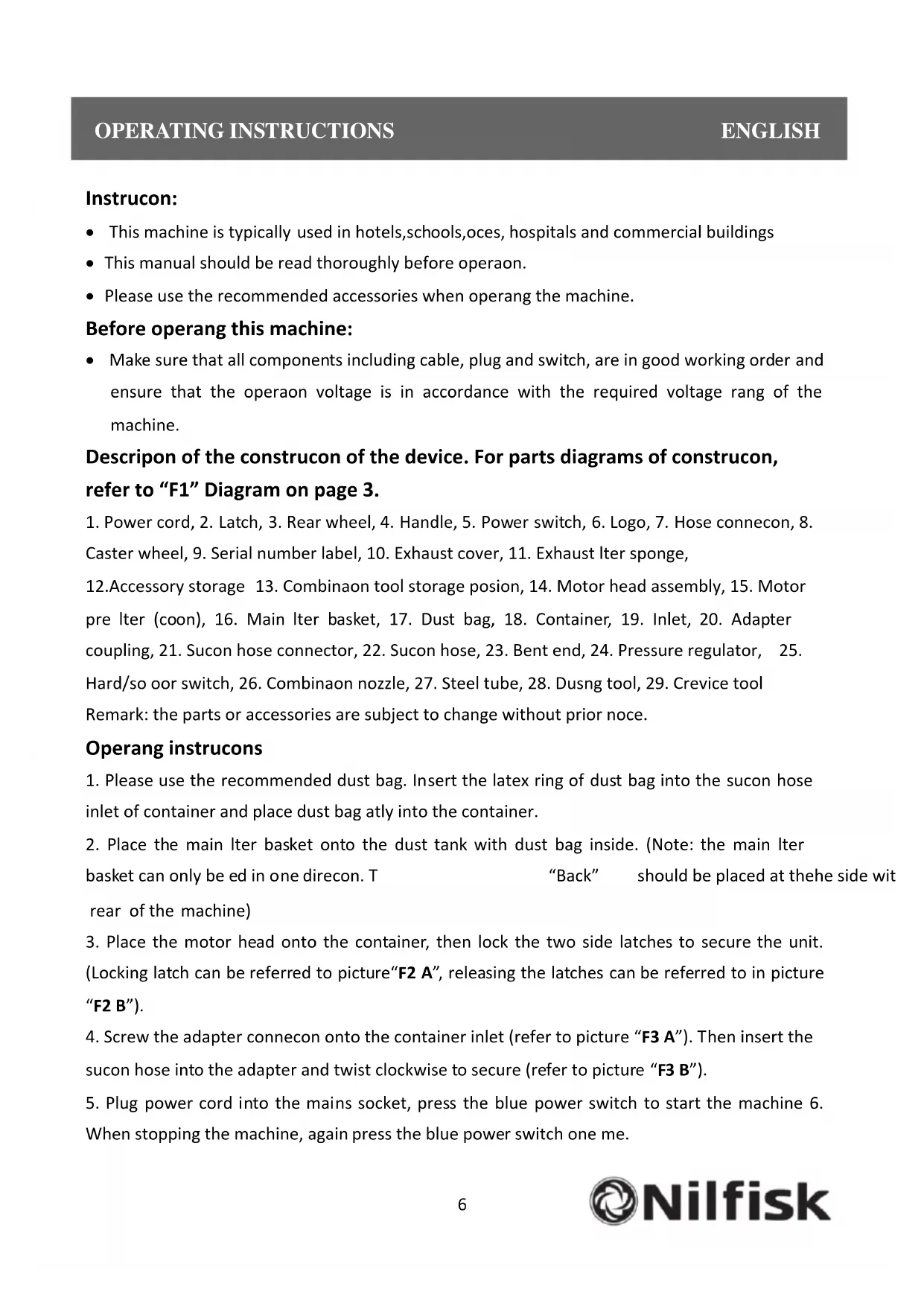 Instruction: This machine is typically used in hotels,schools,offices, hospitals and commercial buildings This manual should be read thoroughly before operation. Please use the recommended accessories when operating the machine. Before operating this machine: Make sure that all components including cable, plug and switch, are in good working order and ensure that the operation voltage is in accordance with the required voltage rating of the machine. Description of the construction of the device. For parts diagrams of construction, refer to “F1” Diagram on page 3.