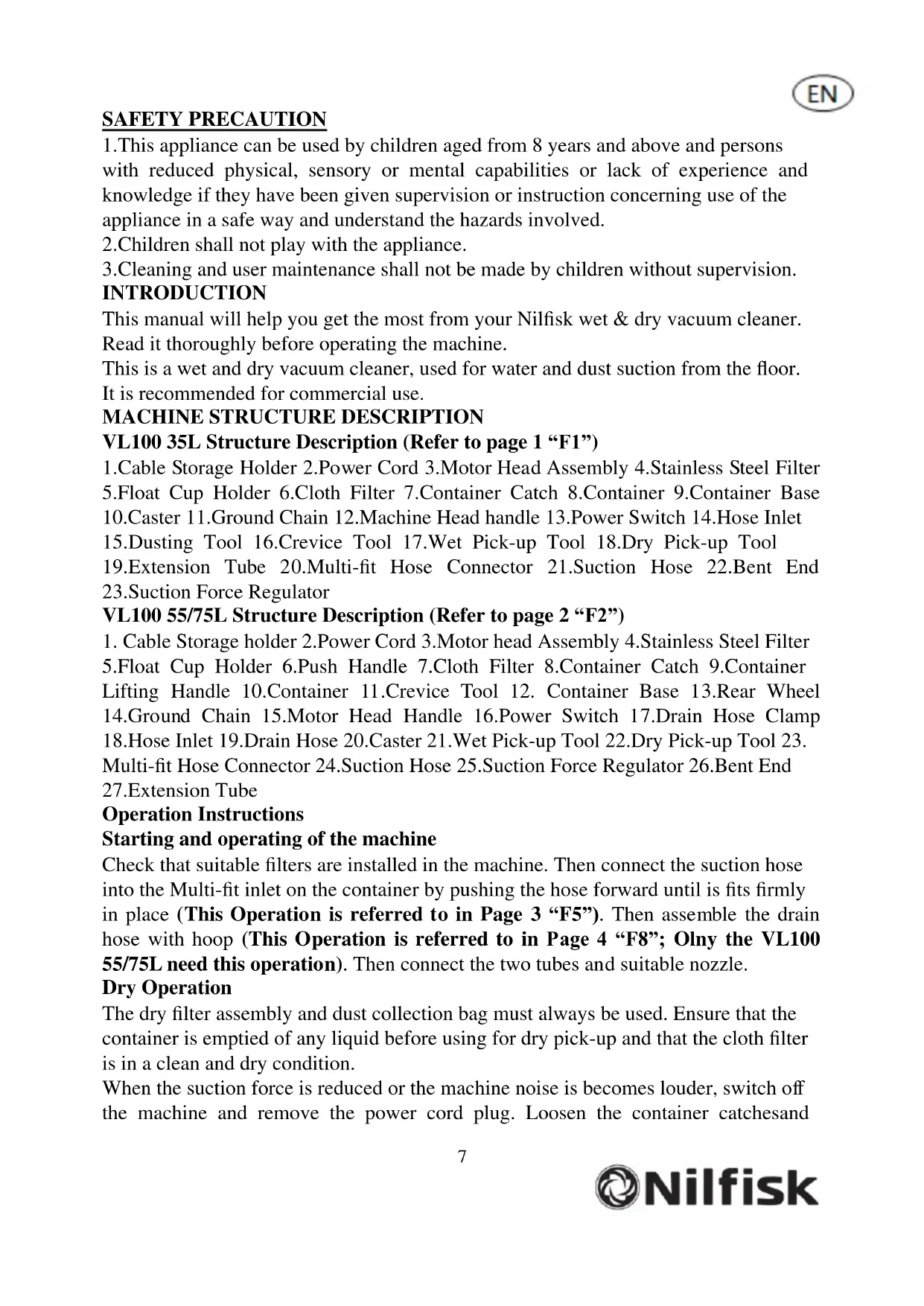 5.Float Cup Holder 6.Push Handle 7.Cloth Filter 8.Container Catch 9.Container Lifting Handle 10.Container 11.Crevice Tool 12. Container Base 13.Rear Wheel 14.Ground Chain 15.Motor Head Handle 16.Power Switch 17.Drain Hose Clamp 18.Hose Inlet 19.Drain Hose 20.Caster 21.Wet Pick-up Tool 22.Dry Pick-up Tool 23. Multi-fit Hose Connector 24.Suction Hose 25.Suction Force Regulator 26.Bent End 27.Extension Tube Operation Instructions Starting and operating of the machine Check that suitable filters are installed in the machine. Then connect the suction hose into the Multi-fit inlet on the container by pushing the hose forward until is fits firmly in place (This Operation is referred to in Page 3 “F5”). Then assemble the drain hose with hoop (This Operation is referred to in Page 4 “F8”; Olny the VL100 55/75L need this operation). Then connect the two tubes and suitable nozzle. Dry Operation The dry filter assembly and dust collection bag must always be used. Ensure that the container is emptied of any liquid before using for dry pick-up and that the cloth filter is in a clean and dry condition. When the suction force is reduced or the machine noise is becomes louder, switch off the machine and remove the power cord plug. Loosen the container catchesand8 remove the motor head assembly. Shake and clean the filter assembly into the container.This should be done while the hose is still connected to avoid dust exiting from the open hose connection. Having shaken the filter, allow a few moments for the dust to settle. Remove the dust filter assembly from machine and empty the container. If the filter’s surface appears to be heavily contaminated, it is advisable to brush the filter material clean with an ordinary soft household brush. This ensures continued peak performance. Having emptied the container, replace the dust filter assembly, replace the motor head assembly and lock tank catches. You are now ready to start again. If the above procedure does not resolve the low suction, please check if the suction hose is blocked. (Dry Control and Operation is referred to in Page 3 “F3”) Use crevice tool for narrow spaces eg narrow gaps and corners (Control and Operation is referred to in Page 3 “F7”) Use Dusting tool to clean more sensitive or fabric surfces e.g. curtains (Control and Operation is referred to in Page 3 “F6”) Wet Operation Ensure to empty any dry dust from the container before using the machine for wet pick-up. Always be sure to use wet pick-up tool with rubber blades. Take out dust bag for wet applications, If the fluid is likely to generate foam, we suggest use the Dry Filter Assembly, which will help prevent foam entering the motor head. When the container fills to its maximum, the suction will stop and the sound of the machine will increase. Switch off the machine and remove the power cord. Remove the motor head and float valve assembly. Move the machine to the drain and empty the liquid from the container via the drain hose. If the suction power becomes lower, the float and filter system may require cleaning. Switch off the machine, remove the power cord and loosen the float basket by turning the basket to the left. A filter is located in the float basket. Check and clean the filter, then reinstall the float system, and make sure that the cup’s “TOP’ side is installed upwards in the direction towards the motor top. To mount the float basket-align the arrow on the basket to the arrow on the housing. Then secure the float basket by turning it to the right. (Control and Operation can be referred Page 3 “F4”) Warranty For your warranty terms, please contact your local Nilfisk Service Centre Attention!!! Before performing any cleaning and maintenance on the vacuum cleaner, always disconnect the plug from the power source.