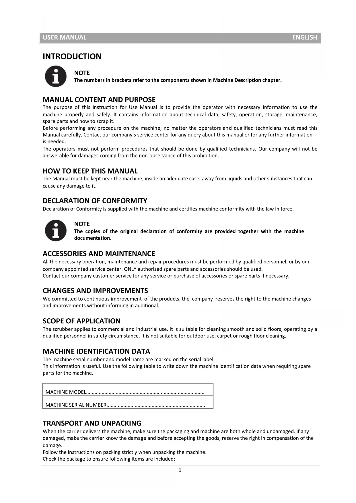 Before using the battery charger, ensure that the values of frequency and voltage indicated on the machine serial number label match those of mains. Never move the machine by pulling the battery charger cable. Do not let the cable through a closed door, or winding on sharp edges or corners. Do not run the machine on the battery charger cable. Keep the battery charger cable away from heated surfaces. Do not charge the batteries if the battery charger cable or the plug are damaged. To reduce the risk of fire, electric shock, or injury, make sure machine is off before leaving. Use or store the machine indoors in dry conditions, it is not allowed for outdoor use. The machine both storage and working temperature must be between 0 °C and +40 °C, the humidity of air must be between 30% - 95%. Do not use the machine on slopes with a gradient exceeding as specification show. When using and handling floor cleaning detergents, follow the instructions on the labels of the detergent bottles and wear suitable gloves and protections. Use brushes and pads supplied with the machine or defined in the manual. Using other brushes or pads could reduce safety. In case of machine malfunctions, ensure that these are not due to lack of maintenance. If necessary, request assistance from the authorized personnel or from an authorized Service Center. Take all necessary precautions to prevent hair, jewels and loose clothes from being caught by the machine moving parts. Do not use the machine in particularly dusty areas. Do not wash the machine with direct or pressured water jets, or with corrosive substances. Do not bump into shelves or scaffoldings, especially where there is a risk of falling objects. Do not lean liquid containers on the machine, use the relevant can holder. To avoid damaging the floor, do not allow the brush/pad to operate while the machine is stationary. In case of fire, use a dry powder fire extinguisher. Do not use liquid fire extinguishers. Do not remove or modify the machine stickers. Do not tamper with the machine safety guards and follow the ordinary maintenance instructions scrupulously. Pay attention during machine transportation when temperature is below freezing point. The water in the recovery tank and in the hoses could freeze and cause seriously damage to the machine. If spare parts need be replaced, order ORIGINAL spare parts from an Authorized Dealers or Retailers. Return the machine to the Service Center if it doesn’t work as usual or it is in condition such as damaged, placed outdoors, dropped into water. To ensure machine proper and safe operation, the scheduled maintenance shown in the relevant chapter of this Manual, must be performed by the authorized personnel or an authorized Service Center. The machine must be properly disposed of, because the presence of toxic-harmful materials (batteries, etc.), which are subject to standards that require disposal in special centers (see Scrapping chapter). This machine as a cleaning tool only, not for any other purpose use. Always keep the openings free from dust, hairs and any other foreign material which could reduce the airflow. Do not use the machine if the openings are clogged. Use the machine only where a proper lighting is provided. This machine is not intended for use by persons with reduced physical, sensory or mental capabilities, or lack of experience and knowledge, unless they have been given supervision or instruction concerning use of the machine by a person responsible for their safety. Close attention is necessary when used near children. Children should be supervised to ensure that they do not play with the machine. While using this machine, take care not to cause damage to people or objects.USER MANUAL ENGLISH