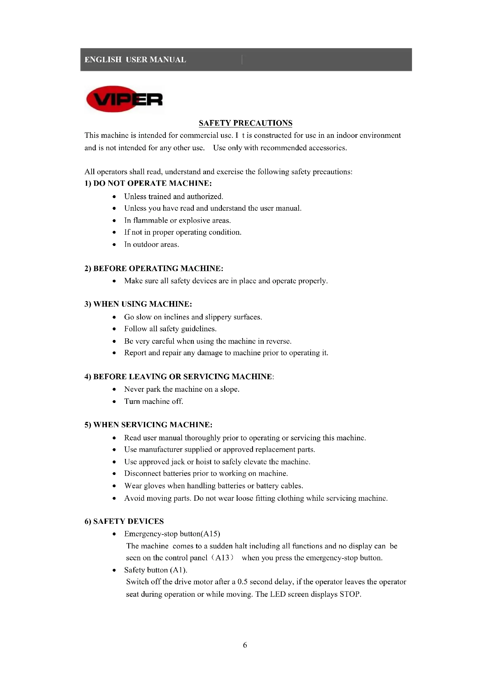 SAFETY PRECAUTIONS This machine is intended for commercial use. I t is constructed for use in an indoor environment and is not intended for any other use. Use only with recommended accessories. All operators shall read, understand and exercise the following safety precautions: