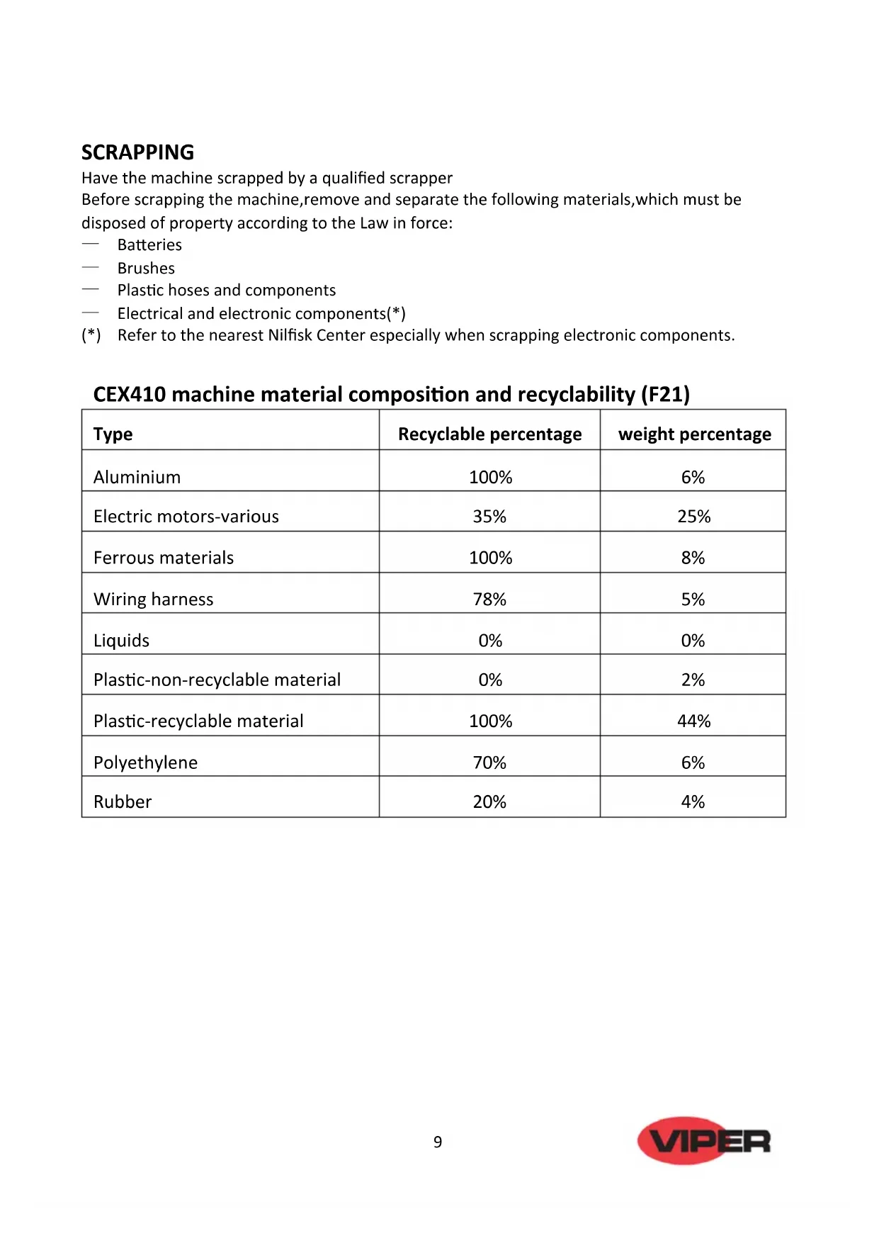 SCRAPPING Have the machine scrapped by a qualified scrapper Before scrapping the machine,remove and separate the following materials,which must be disposed of property according to the Law in force: — Batteries — Brushes — Plastic hoses and components — Electrical and electronic components(*) (*) Refer to the nearest Nilfisk Center especially when scrapping electronic components. CEX410 machine material composition and recyclability (F21) Type Recyclable percentage weight percentage Aluminium 100%