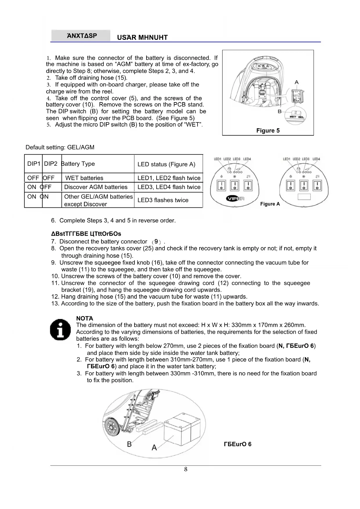 battery cover (10). Remove the screws on the PCB stand. The DIP switch (B) for setting the battery model can be seen when flipping over the PCB board. (See Figure 5)