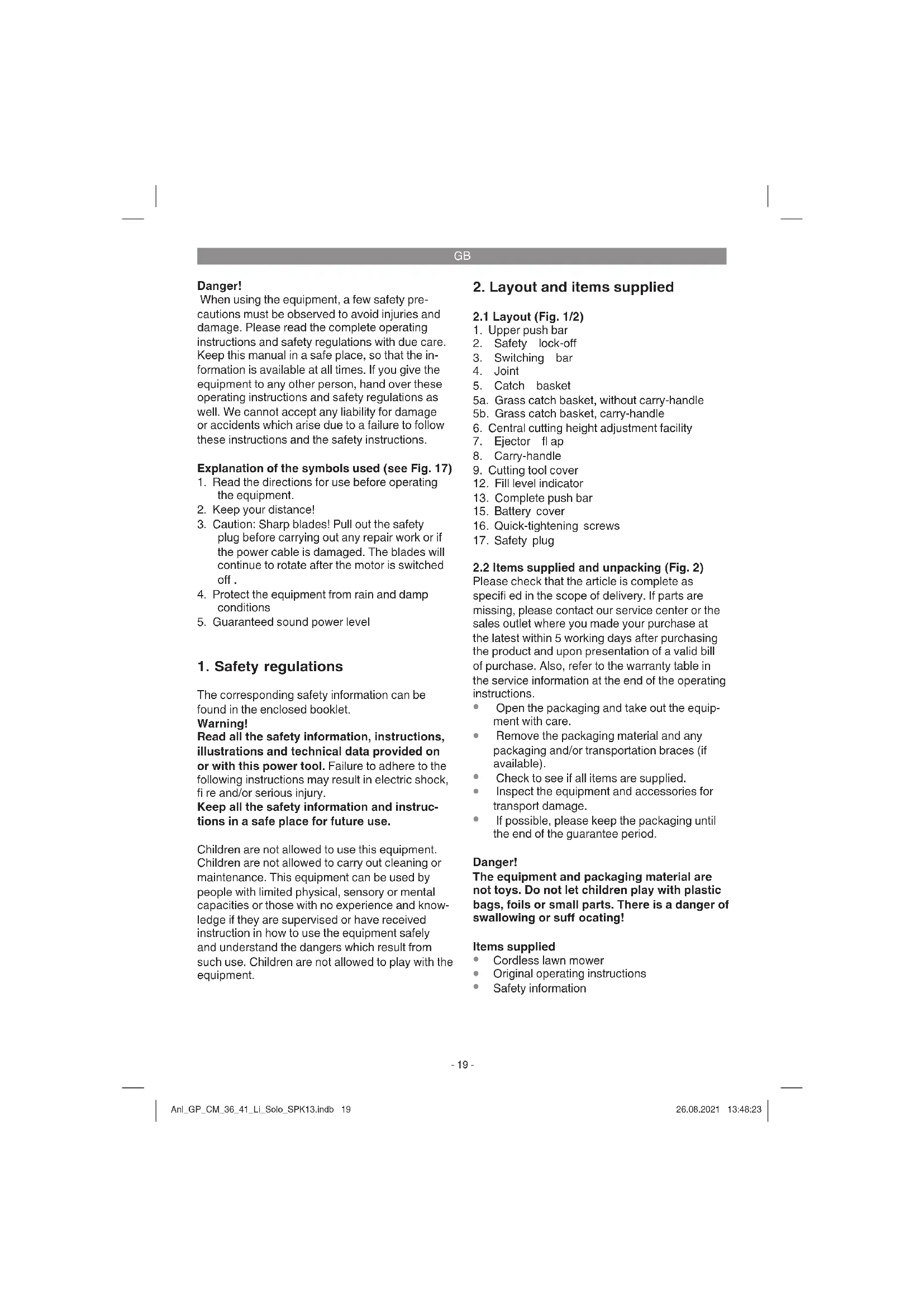 The equipment is supplied in packaging to pre- vent it from being damaged in transit. The raw materials in this packaging can be reused or recycled. The equipment and its accessories are made of various types of material, such as metal and plastic. Never place defective equipment in your household refuse. The equipment should be taken to a suitable collection center for proper disposal. If you do not know the whereabouts of such a collection point, you should ask in your local council offi ces. Anl_GP_CM_36_41_Li_Solo_SPK13.indb 25Anl_GP_CM_36_41_Li_Solo_SPK13.indb 25 26.08.2021 13:48:2526.08.2021 13:48:25GB