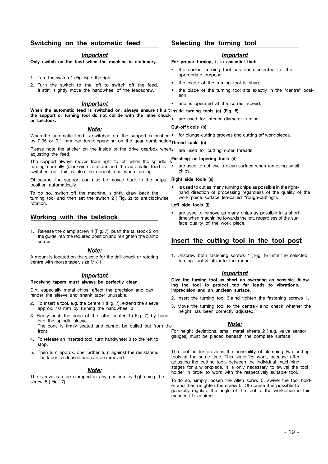 stiff, slightly move the handwheel of the leadscrew. Important When the automatic feed is switched on, always ensurethat the support or turning tool do not collide with the lathe chuck or tailstock. Note: When the automatic feed is switched on, the support is pushed by 0.05 or 0.1 mm per turndepending on the gear combination. Please note the sticker on the inside of the drive gearbox when adjusting the feed. The support always moves from right to left when the spindle is turning normally (clockwise rotation) and the automatic feed is switched on. This is also the normal feed when turning. Of course, the support can also be moved back to the output position automatically. To do so, switch offthe machine, slightly draw back the turning tool and then set the switch 2(Fig. 2) to anticlockwise rotation. Working with the tailstock