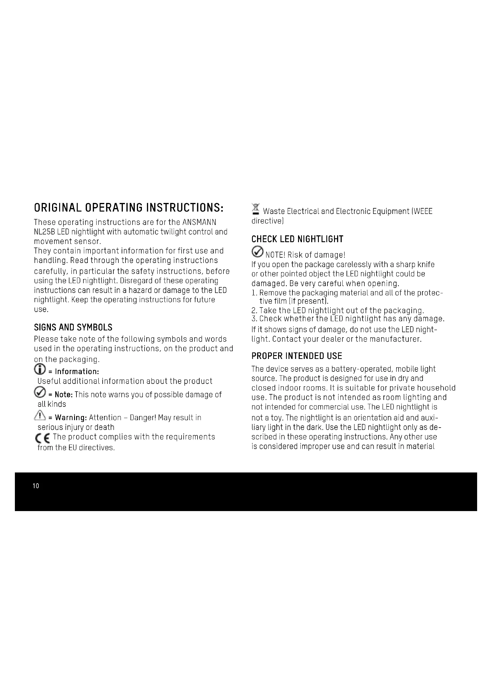 The device serves as a battery-operated, mobile light source. The product is designed for use in dry and closed indoor rooms. It is suitable for private household use. The product is not intended as room lighting and not intended for commercial use. The LED nightlight is not a toy. The nightlight is an orientation aid and auxi- liary light in the dark. Use the LED nightlight only as de- scribed in these operating instructions. Any other use is considered improper use and can result in material11 damage. The manufacturer or dealer accepts no liability for damage arising from improper use or misuse. SAFETY INSTRUCTIONS §Do not open or modify the product! §Never cover the LED night- light when it is operating. §Never submerge the product in water or other liquids. Avoid dripping water. Always keep the product dry. §Use the LED nightlight only indoors. Never operate it in damp rooms or in the rain. §If you are not using the LED nightlight or if a fault arises, always switch off the LED nightlight and disconnect it from the power source. §The LED light source cannot be replaced. When the LED comes to the end of its ser- vice life, the complete lamp must be replaced. §Failure to observe the sa- fety instructions can result in dangerous injuries to persons or damage to the device! §This product is not to be used by persons (including children) who have restric- ted physical, sensory or mental capabilities or who Deutsch | English | Français | Español | Português | Svenska Italiano | Nederlands | Dansk | Suomi | Norsk12 do not have adequate ex- perience and knowledge in handling this product. §Keep the product and the packaging away from chil- dren. §Do not allow children to play with the packaging film. They could become caught in it while playing and suf- focate. §Risk of damage! §Improper handling of the LED nightlight can result in damage. §Do not continue to use the LED nightlight if the plas- tic components of the LED nightlight are cracked, torn or deformed. §Do not expose the LED nightlight to extreme tem- peratures or severe mecha- nical loads. Otherwise, this can result in deformation of the LED nightlight.