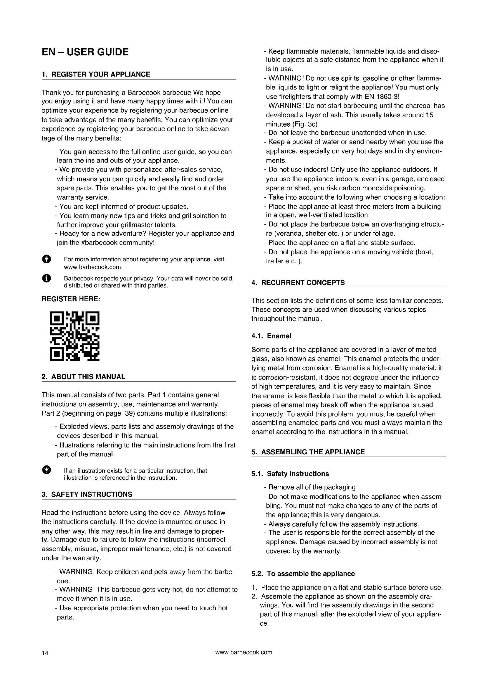 Thank you for purchasing a Barbecook barbecue We hope you enjoy using it and have many happy times with it! You can optimize your experience by registering your barbecue online to take advantage of the many benets. You can optimize your experience by registering your barbecue online to take advan- tage of the many benets: - You gain access to the full online user guide, so you can learn the ins and outs of your appliance. - We provide you with personalized after-sales service, which means you can quickly and easily nd and order spare parts. This enables you to get the most out of the warranty service. - You are kept informed of product updates. - You learn many new tips and tricks and grillspiration to further improve your grillmaster talents. - Ready for a new adventure? Register your appliance and join the #barbecook community!