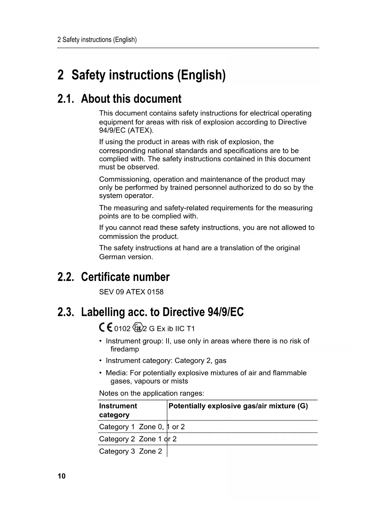 2 Safety instructions (English) 2.1. About this document This document contains safety instructions for electrical operating equipment for areas with risk of explosion according to Directive 94/9/EC (ATEX). If using the product in areas with risk of explosion, the corresponding national standards and specifications are to be complied with. The safety instructions contained in this document must be observed. Commissioning, operation and maintenance of the product may only be performed by trained personnel authorized to do so by the system operator. The measuring and safety-related requirements for the measuring points are to be complied with. If you cannot read these safety instructions, you are not allowed to commission the product. The safety instructions at hand are a translation of the original German version. 2.2. Certificate number SEV 09 ATEX 0158 2.3. Labelling acc. to Directive 94/9/EC 0102 II 2 G Ex ib IIC T1