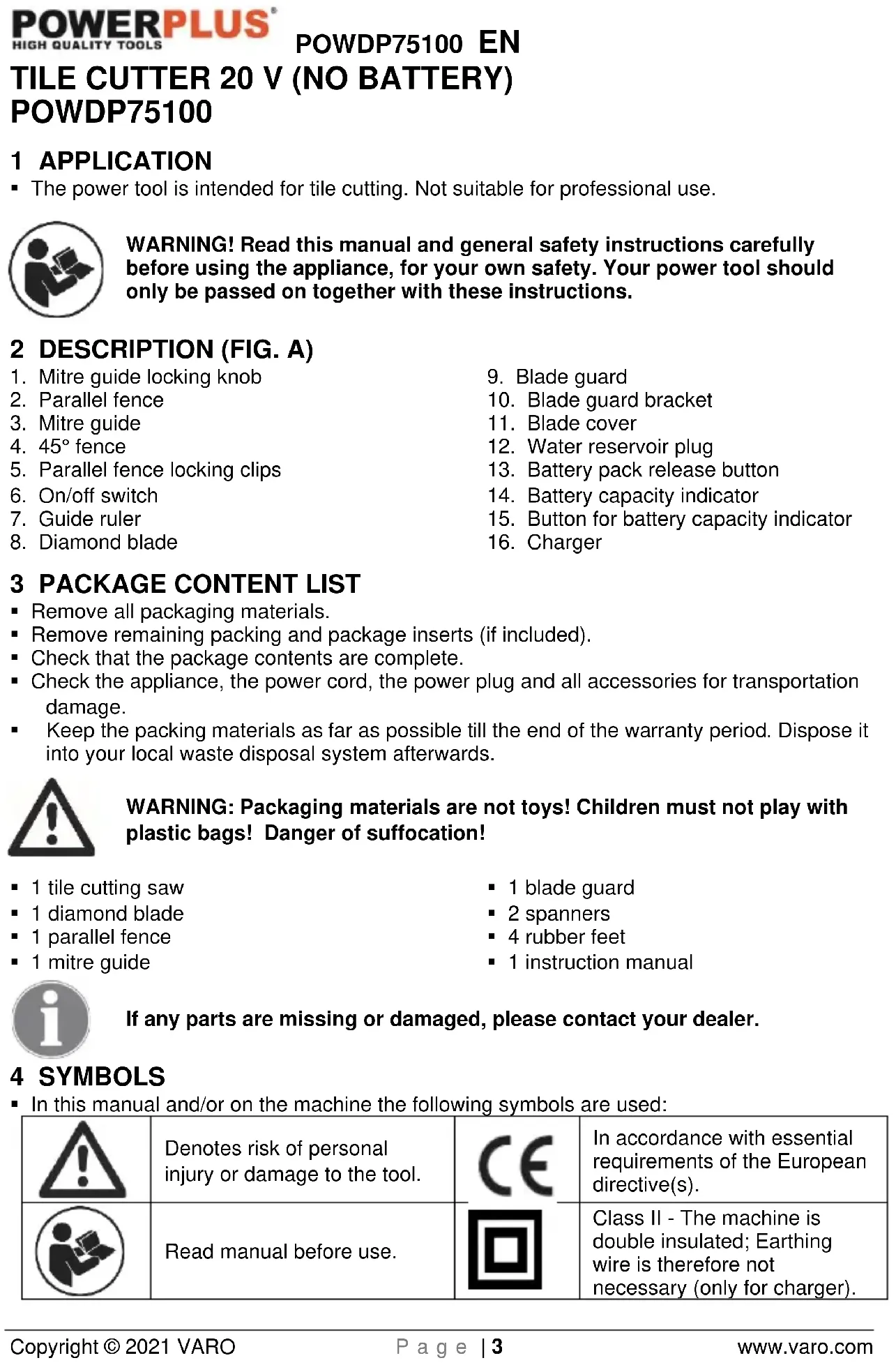 - Our machines have been designed to operate over a long period of time with a minimum of maintenance. Continuous satisfactory operation depends upon proper machine care and regular cleaning.POWDP75100 EN Copyright © 2021 VARO P a g e | 12 www.varo.com 13 TECHNICAL DETAILS Cutting wheel diameter: 110 mm Power supply 20 Volt DC Maximum speed 3800 min-1 Blade size 110 mm x 22.2 mm Cutting depth 24 mm Water tray Yes Blade material Diamond tip 14 NOISE
