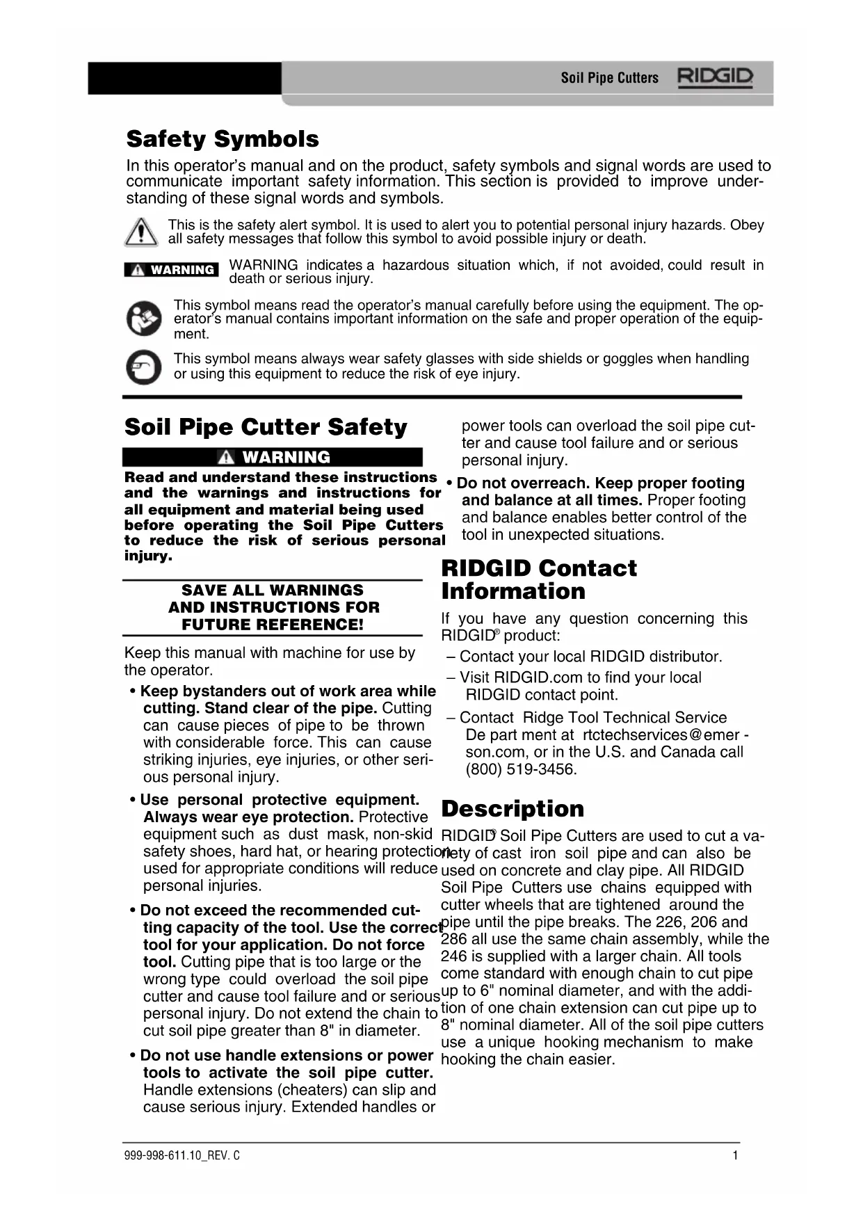 Soil Pipe Cutters are used to cut a va- riety of cast iron soil pipe and can also be used on concrete and clay pipe. All RIDGID Soil Pipe Cutters use chains equipped with cutter wheels that are tightened around the pipe until the pipe breaks. The 226, 206 and 286 all use the same chain assembly, while the 246 is supplied with a larger chain. All tools come standard with enough chain to cut pipe up to 6" nominal diameter, and with the addi- tion of one chain extension can cut pipe up to 8" nominal diameter. All of the soil pipe cutters use a unique hooking mechanism to make hooking the chain easier. Soil Pipe Cutter Safety WARNING Read and understand these instructions and the warnings and instructions for all equipment and material being used before operating the Soil Pipe Cutters to reduce the risk of serious personal injury.