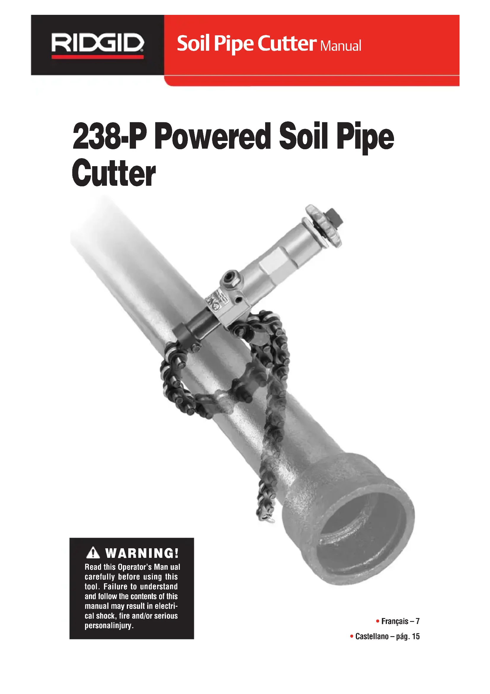 - Castellano – pág. 15 WARNING! Read this Operator’s Man ual carefully before using this tool. Failure to understand and follow the contents of this manual may result in electri- cal shock, fire and/or serious person al injury. Soil Pipe Cutter ManualII 238-P Soil Pipe Cutter Table of Contents Safety Symbols.....................................................................................................ii General Safety Rules Work Area Safety...............................................................................................1 Personal Safety..................................................................................................1 Tool Use and Care ............................................................................................1 Service...............................................................................................................1 Specific Safety Information.................................................................................1 Description and Specifications Description.........................................................................................................2 Specifications.....................................................................................................2 Pre-Operation Inspection/Maintenance .............................................................2 Tool Set-Up and Operation..................................................................................3 Cutting Tips ..........................................................................................................5 Lifetime Warranty.................................................................................Back Cover *Original Instructions - English Safety Symbols In this operator’s manual and on the product, safety symbols and signal words are used to communicate important safety information. This section is provided to improve understand- ing of these signal words and symbols. This is the safety alert symbol. It is used to alert you to potential personal injury hazards. Obey all safety messages that follow this symbol to avoid possible injury or death. DANGER indicates a hazardous situation which, if not avoided, will result in death or serious injury. WARNING indicates a hazardous situation which, if not avoided, could result in death or serious injury. CAUTION indicates a hazardous situation which, if not avoided, could result in minor or moderate injury. NOTICE indicates information that relates to the protection of property. This symbol means read the operator’s manual carefully before using the equipment. The op- erator’s manual contains important information on the safe and proper operation of the equip- ment. This symbol means always wear safety glasses with side shields or goggles when handling or using this equipment to reduce the risk of eye injury. This symbol indicates the risk of hands, fingers or other body parts being crushed. NOTICEDANGERWARNINGCAUTION1 238-P Soil Pipe Cutter operate the tool. Tools can be danger- ous in the hands of untrained users.