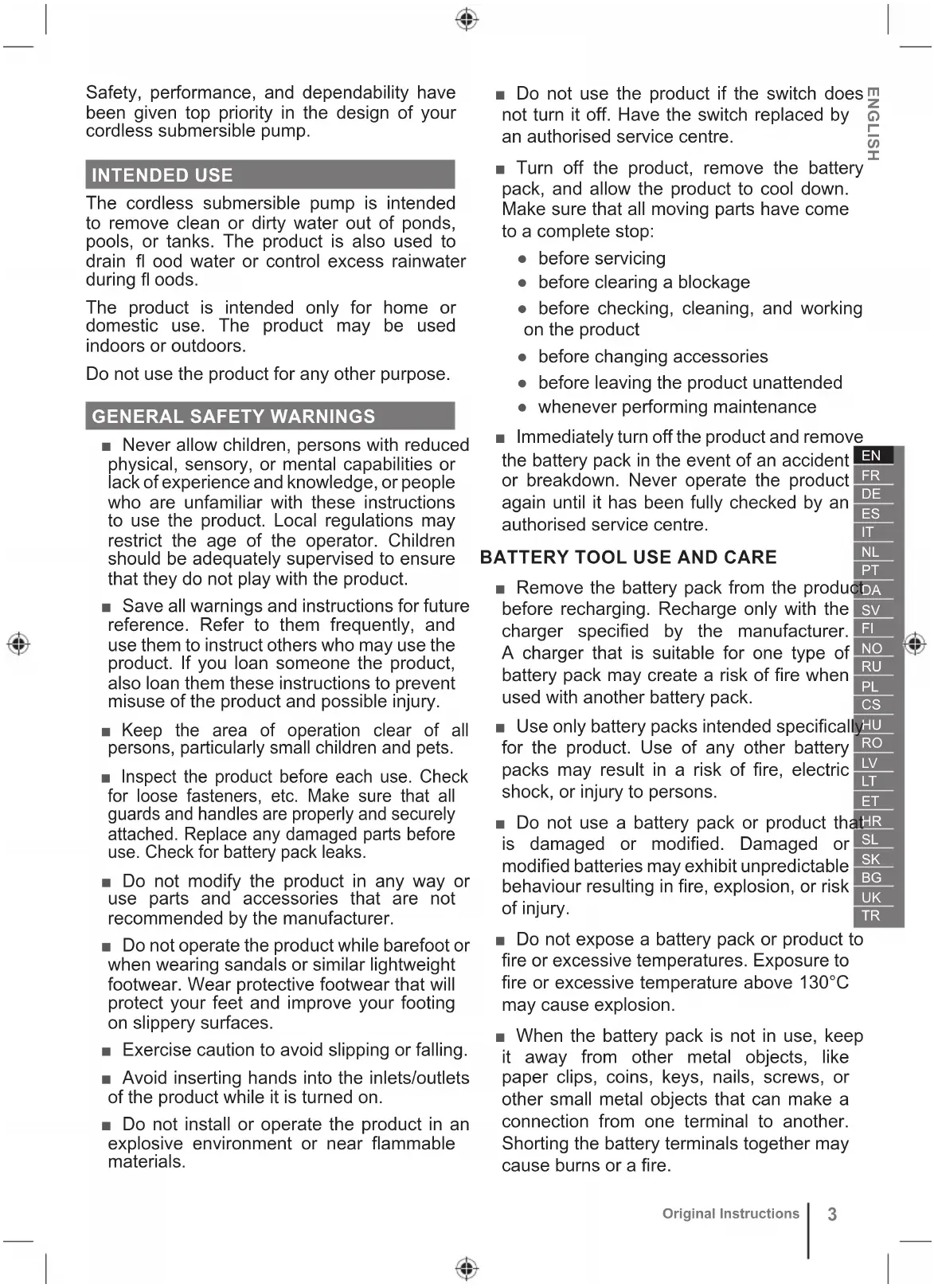Original Instructions Safety, performance, and dependability have been given top priority in the design of your cordless submersible pump. INTENDED USE The cordless submersible pump is intended to remove clean or dirty water out of ponds, pools, or tanks. The product is also used to drain fl ood water or control excess rainwater during fl oods. The product is intended only for home or domestic use. The product may be used indoors or outdoors. Do not use the product for any other purpose.