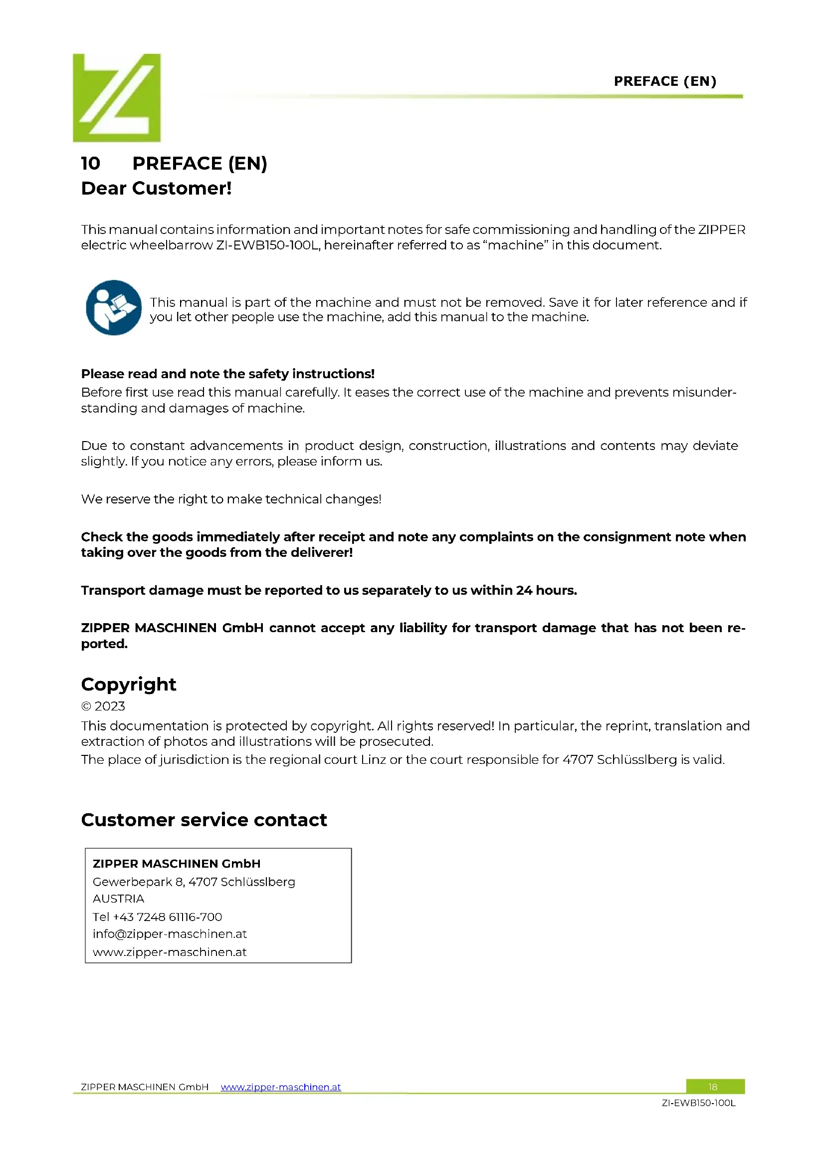 Please read and note the safety instructions! Before first use read this manual carefully. It eases the correct use of the machine and prevents misunder- standing and damages of machine. Due to constant advancements in product design, construction, illustrations and contents may deviate slightly. If you notice any errors, please inform us. We reserve the right to make technical changes! Check the goods immediately after receipt and note any complaints on the consignment note when taking over the goods from the deliverer! Transport damage must be reported to us separately to us within 24 hours. ZIPPER MASCHINEN GmbH cannot accept any liability for transport damage that has not been re- ported. Copyright © 2023 This documentation is protected by copyright. All rights reserved! In particular, the reprint, translation and extraction of photos and illustrations will be prosecuted. The place of jurisdiction is the regional court Linz or the court responsible for 4707 Schlüsslberg is valid.