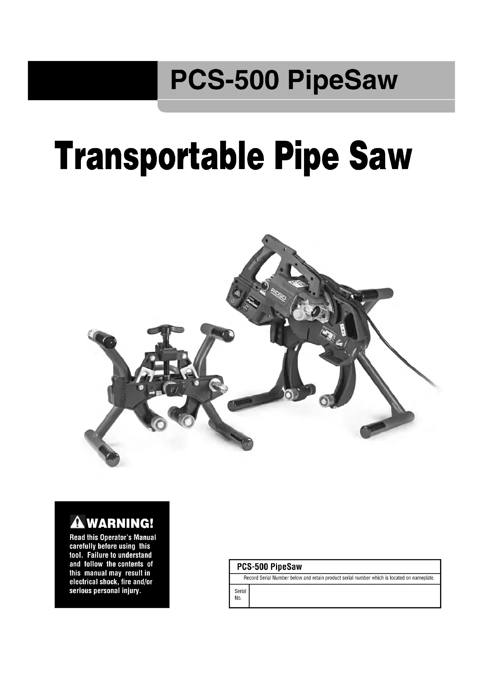 - Sound measurements are measured in accordance with a standardized test per Standard 62841-1. - Sound emissions may vary due to your location and specific use of these tools. - Daily exposure levels for sound need to be evaluated for each application and appropriate safety measures taken when needed. Evaluation of exposure levels should consider the time a tool is switched off and not in use. This may significantly reduce the exposure level over the total working period. ** Pipe Out of Roundness = Maximum outside pipe diameter minus minimum outside pipe diameter (pipe diameter measured with calipers). *** Cermet-Tipped Blade is optimized for standard mild carbon steel. Reduced blade life can be expected on other materials. Ability to cut depends on a variety of factors, including material type, chemistry, hardness, amount of material being removed and other factors. In some cases, cuts may not be able to be made or may result in blade damage. If there are any questions about specific material to be cut, contact Ridge Tool Technical Service Department. Selection of appropriate materials and instal- lation, joining and forming methods is the responsibility of the system designer and/or installer. Selection of improp- er materials and methods could cause system failure. Stainless steel and other corrosion resistant materials can be contaminated during installation, joining and form- ing. This contamination could cause corrosion and pre- mature failure. Careful evaluation of materials and methods for the specific service conditions, including chemical and temperature, should be completed before any instal- lation is attempted. (See NOTICE in Workpiece Preparation section.) NOTICEStandard Equipment Refer to the RIDGID catalog for details on equipmentsupplied with specific machine catalog numbers.Figure 5 – Machine Serial Number (Serial number plate islocated on saw body near chip chute exit win-dow. The last 4 digits indicate the month andyear of manufacture.) Pre-Operation Inspection WARNINGBefore each use, inspect your PCS-500 Transport-able Pipe Saw and correct any problems to reducethe risk of serious injury from electric shock, entan-glement, crushing injuries and other causes andprevent Machine damage.Always wear safety glasses, and other appropri-ate protective equipment when inspecting yourPCS-500 Transportable Pipe Saw.1. Make sure that the PCS-500 Transportable Pipe Sawis unplugged and press the OFF (O) button.2. Clean the machine. Clean any oil, grease, dirt, orchips from the saw, including the handles and controls.This aids inspection and helps prevent the machine orcontrol from slipping from your grip. Clean and main-tain the machine per the Maintenance Instructions.3. Inspect the PCS-500 Transportable Pipe Saw andclamp for the following: •Cord and plug for damage or modification.• Proper assembly, maintenance and completeness.• Any broken, worn, missing, misaligned or bindingparts or other damage.• Presence and readability of the warning and instruc-tion labels (See Figure 1, 2 and 6).• Saw blade guards for correct operation – if openedshould close quickly under spring force. Guardsshould not stick. If needed, clean chips from insidethe chip chute and blade cover, see MaintenanceInstructions.• Condition of the saw blade. Dull or damaged bladesincrease required force, produce poor results andincrease the risk of injury. Chose the appropriateRIDGID recommended saw blade for the material tobe cut. Confirm blade is properly secured to saw.• Clamp wheel knurl is clean and in good condition. Ifneeded, clean with a wire brush. Worn or dirtyclamp wheel knurls can cause slippage or trackingissues in use. Dirty clamp wheels and knurls cancause ferrous contamination of stainless steel. • Confirm chip chute is clear.• Any other condition which may prevent safe andnormal operation.If any issues are found, do not use the tool until theissues have been repaired.Figure 6 – Warnings4. Inspect and maintain any other equipment beingused per its instructions to make sure it is functioningproperly. Set-Up And Operating Instructions WARNINGAlways wear appropriate eye protection and hearingprotection. Cutting tools can break or shatter. Cut tingproduces chips that can be thrown or fall into eyes.Cutting produces high noise levels that over time candamage your hearing.999-995-226.10_REV. A8 PCS-500 PipeSaw Ridge Tool Company, Elyria, Ohio,U.S.A. RIDGID.com Model No. Serial No.