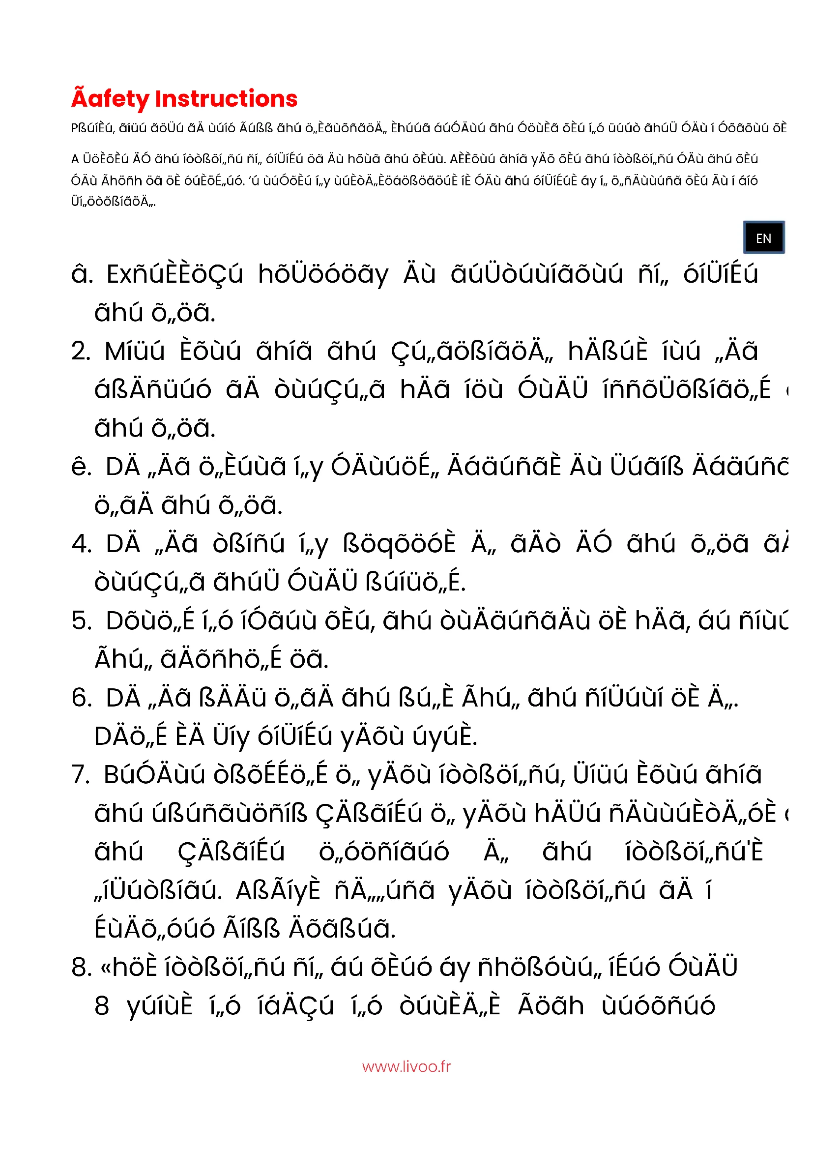@Livoo ENwww.livoo.fr Safety Instructions Please, take time to read well the instruction sheet before the first use and keep them for a future use. A misuse of the appliance can damage it or hurt the user. Assure that you use the appliance for the use for which it is designed. We refuse any responsibilities as for the damages by an incorrect use or a bad manipulation.