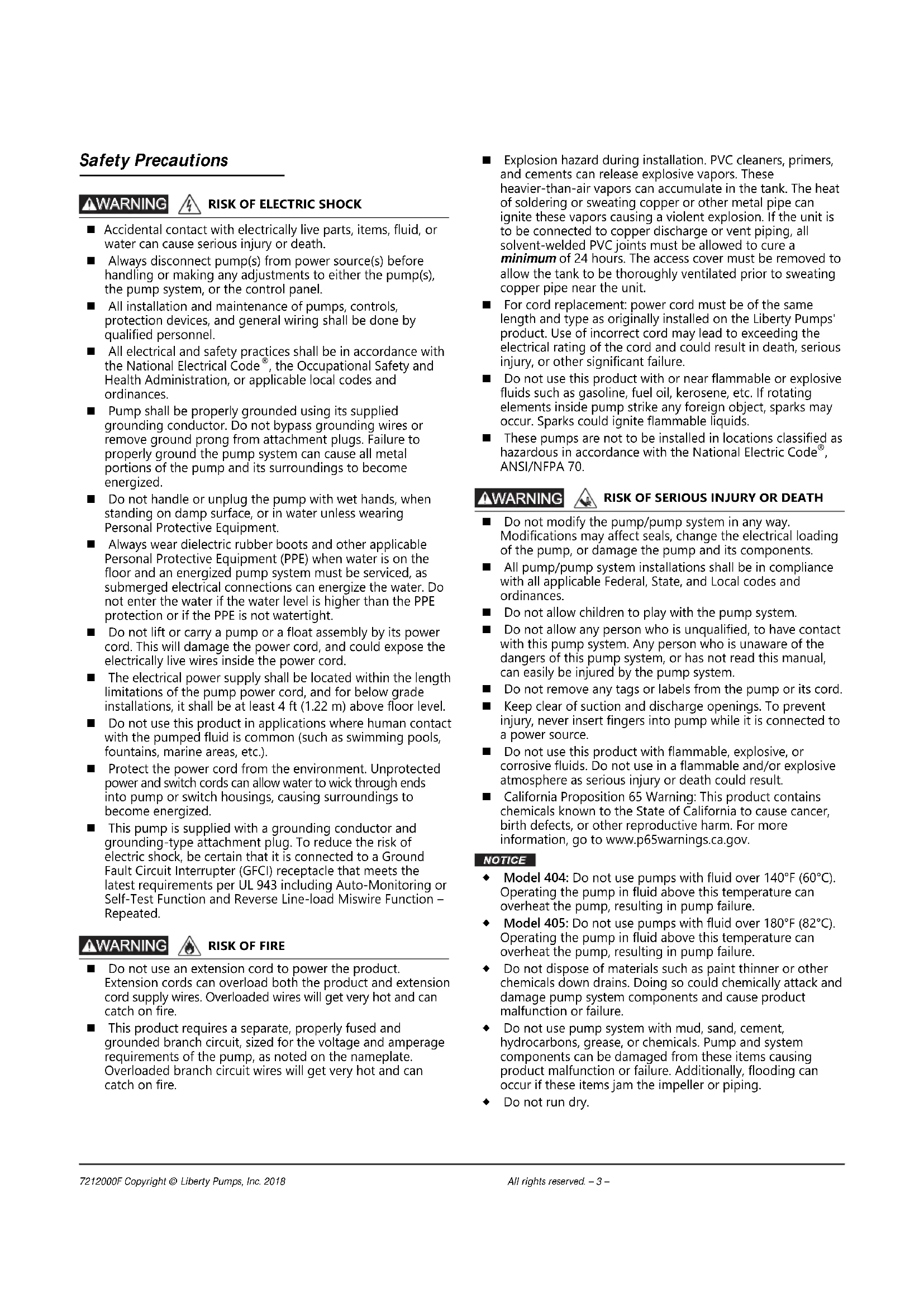 ANSI/NFPA 70. Do not modify the pump/pump system in any way. Modifications may affect seals, change the electrical loading of the pump, or damage the pump and its components. All pump/pump system installations shall be in compliance with all applicable Federal, State, and Local codes and ordinances. Do not allow children to play with the pump system. Do not allow any person who is unqualified, to have contact with this pump system. Any person who is unaware of the dangers of this pump system, or has not read this manual, can easily be injured by the pump system. Do not remove any tags or labels from the pump or its cord. Keep clear of suction and discharge openings. To prevent injury, never insert fingers into pump while it is connected to a power source. Do not use this product with flammable, explosive, or corrosive fluids. Do not use in a flammable and/or explosive atmosphere as serious injury or death could result. California Proposition 65 Warning: This product contains chemicals known to the State of California to cause cancer, birth defects, or other reproductive harm. For more information, go to www.p65warnings.ca.gov. NOTICE Model 404: Do not use pumps with fluid over 140°F (60°C). Operating the pump in fluid above this temperature can overheat the pump, resulting in pump failure. Model 405: Do not use pumps with fluid over 180°F (82°C). Operating the pump in fluid above this temperature can overheat the pump, resulting in pump failure. Do not dispose of materials such as paint thinner or other chemicals down drains. Doing so could chemically attack and damage pump system components and cause product malfunction or failure. Do not use pump system with mud, sand, cement, hydrocarbons, grease, or chemicals. Pump and system components can be damaged from these items causing product malfunction or failure. Additionally, flooding can occur if these items jam the impeller or piping. Do not run dry. WARNING