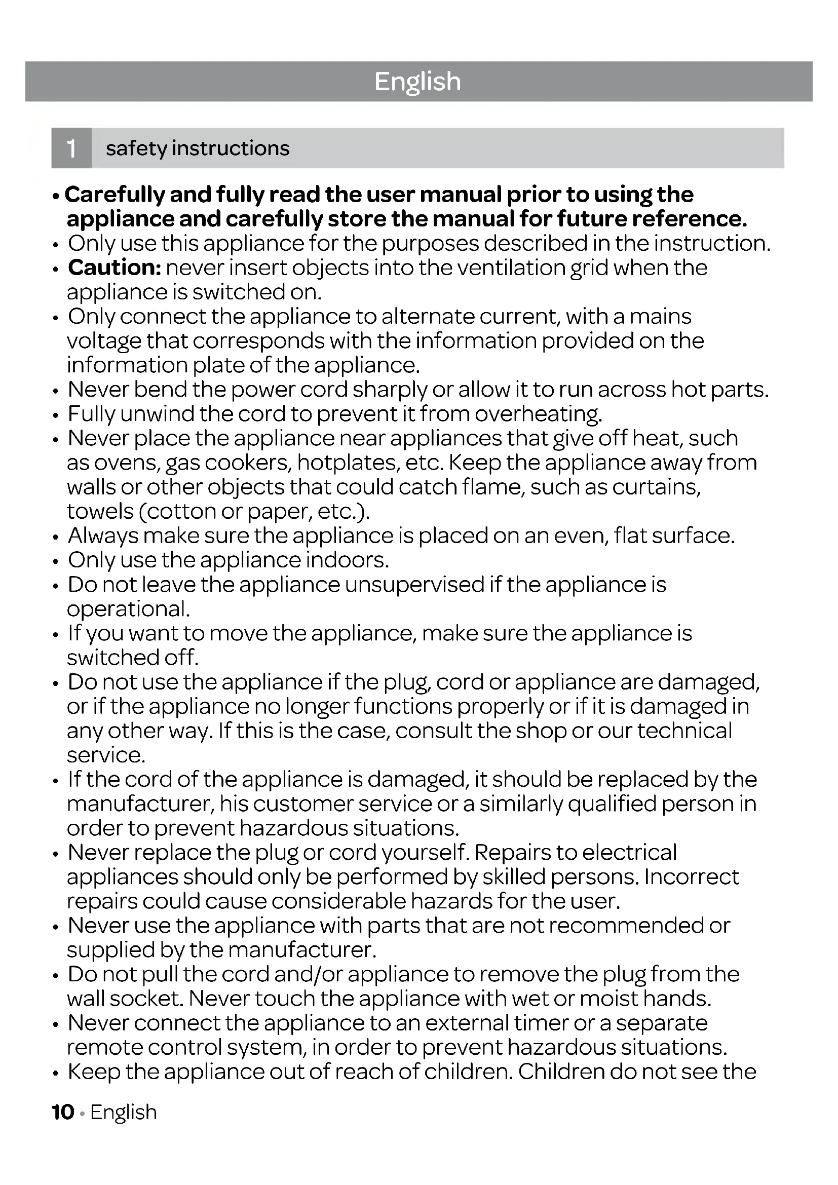 - Keep the appliance out of reach of children. Children do not see theEnglish • 11 dangers when handling electrical appliances. Therefore, never allow children to work with electrical appliances without supervision. Keep the appliance and cord out of reach of children younger than 8 years of age.