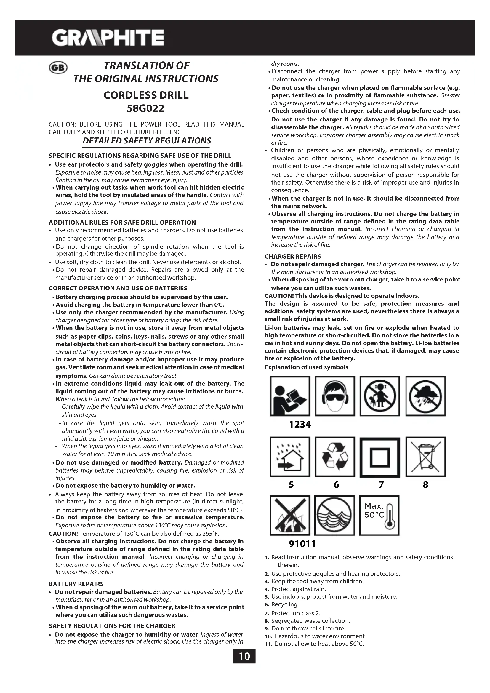 - Store the device with the battery removed. All defects should be repaired by service workshop authorized by the manufacturer. TECHNICAL PARAMETERS RATED PARAMETERS Cordless drill 58G022 Parameter Value Battery voltage 18 V DC Range of idle rotational speed gear I 0-350 rpm gear II 0-1250 rpm Range of quick release chuck 0,8 - 10 mm Tool holder 6,35 mm (¼ ‘’) Torque control range 1–19 + drilling Max. torque (soft drive) 28 Nm Max. torque (hard drive) 44 Nm Protection class III Weight 1,1 kg Year of production 2020 58G022 denes type and indication of the device Graphite Energy+ System Battery Parameter Value Battery 58G001 58G004 Battery voltage 18 V DC 18 V DC Battery type Li-Ion Li-Ion Battery capacity 2000 mAh 4000 mAh Ambient temperature range 4