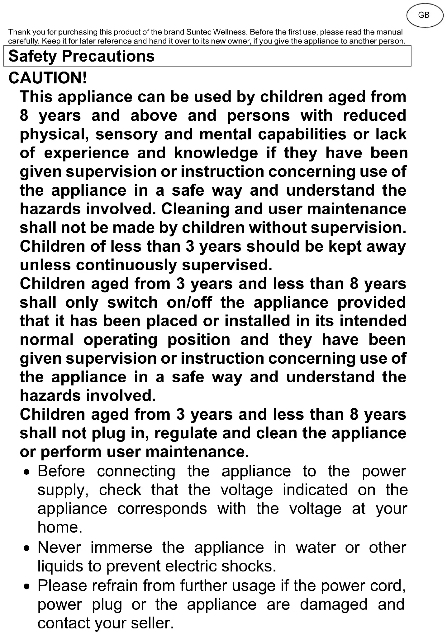 Thank you for purchasing this product of the brand Suntec Wellness. Before the first use, please read the manual carefully. Keep it for later reference and hand it over to its new owner, if you give the appliance to another person. Safety Precautions CAUTION! This appliance can be used by children aged from 8 years and above and persons with reduced physical, sensory and mental capabilities or lack of experience and knowledge if they have been given supervision or instruction concerning use of the appliance in a safe way and understand the hazards involved. Cleaning and user maintenance shall not be made by children without supervision. Children of less than 3 years should be kept away unless continuously supervised. Children aged from 3 years and less than 8 years shall only switch on/off the appliance provided that it has been placed or installed in its intended normal operating position and they have been given supervision or instruction concerning use of the appliance in a safe way and understand the hazards involved. Children aged from 3 years and less than 8 years shall not plug in, regulate and clean the appliance or perform user maintenance.