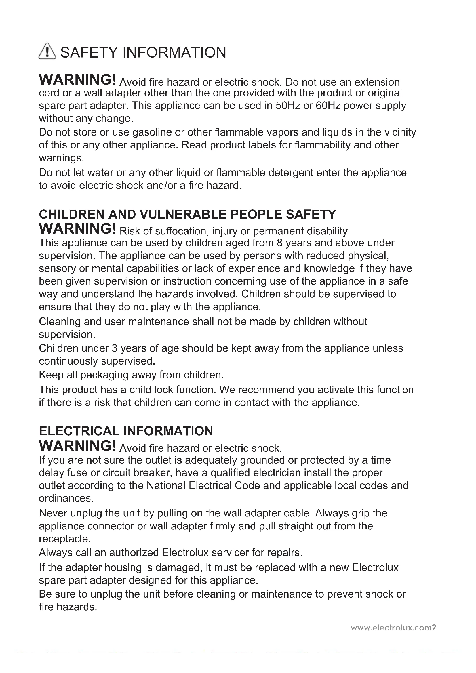 LATVIEŠU LIETUVIŠKAI EESTI KEELESwww.electrolux.com2 SAFETY INFORMATION WARNING! Avoid re hazard or electric shock. Do not use an extension cord or a wall adapter other than the one provided with the product or original spare part adapter. This appliance can be used in 50Hz or 60Hz power supply without any change. Do not store or use gasoline or other ammable vapors and liquids in the vicinity of this or any other appliance. Read product labels for ammability and other warnings. Do not let water or any other liquid or ammable detergent enter the appliance to avoid electric shock and/or a re hazard.