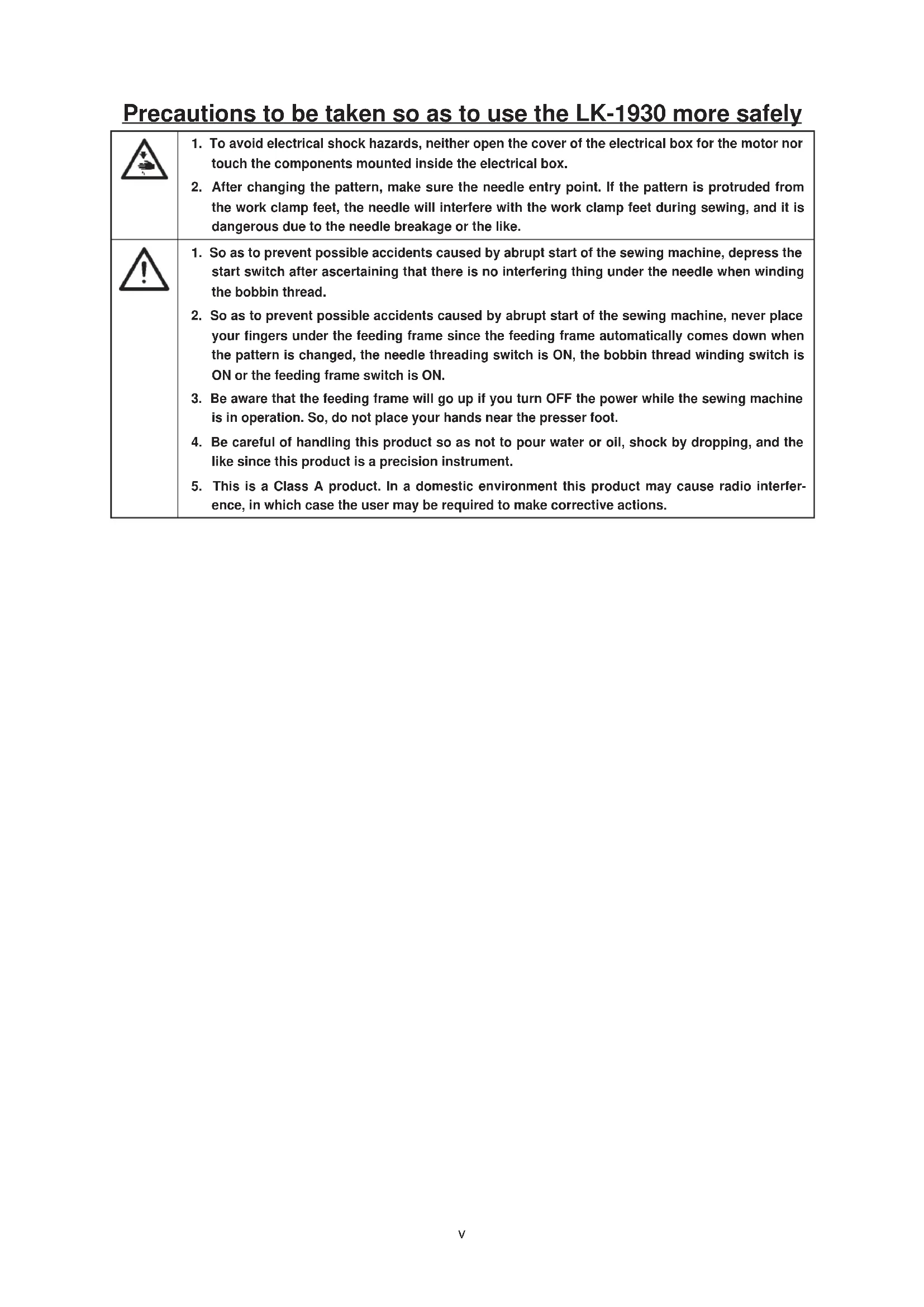 ence, in which case the user may be required to make corrective actions.vi Safety devices and warning labels In addition, be aware that the safety devices such as the "eye protection cover" and "À nger guard" are sometimes omitted in the sketches, illustrations and À gures included in the Instruction Manual for the explanation's sake. In the practical use, never remove those safety devices. CAUTION Thread take-up lever cover This is a cover for pre- venting contact between the human body and the thread take-up lever. Warning label (Refer to the warn- ing label on page i.) The label gives the minimum precau- tions to be taken when operating the sewing machine. Eye protection cover This is a cover for pro- tecting eyes from being injured by a broken needle. Finger guard This is a cover for preventing contact be- tween À ngers and the needle. Motor cover This is a cover for preventing contact between the motor and magnet and the human body. Warning label against pinching This label warns that À ngers or other parts of human body can be pinched in the thread take-up lever. Warning label against pinching This label warns that hands can be pinched under the sewing machine. Warning label against pinching This label indicates that there is a risk of pinching hands between the machine head and the feed bracket. Power switch This is a switch for discon- necting the power unit of the sewing machine from the power supply. Power switch (EU type) This switch is used for disconnecting the power unit of the sewing machine from the power sup- ply. It is also used as the emergency stop switch. Selection of the power switch Use the IEC60204-1-compliant power switch with rated current of 20 A or more and short-circuit breaking capac- ity of 120 A or more, which has the operating section in red against the yellow back- ground. Electrical-shock danger label (EU type) (Refer to "Electri- cal-shock danger label" on page i.) In order to protect against electrical shock, safety precau- tions to be taken to avoid danger are written on this label.vii ENGLISH DECLARATION OF INCORPORATION OF PARTLY COMPLETED MACHINERY We hereby declare that the sewing machine (sewing head) described below ;