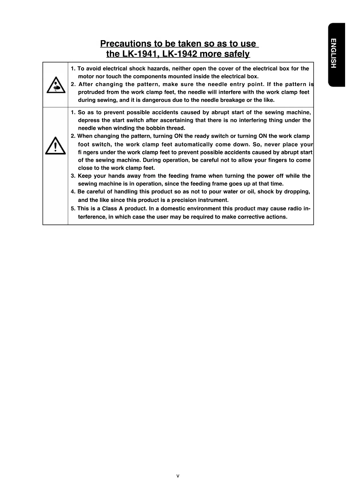 For the sewing machine, automatic machine and ancillary devices (hereinafter collectively referred to as "machine"), it is inevitable to conduct sewing work near moving parts of the machine. This means that there is always a possibility of unintentionally coming in contact with the moving parts. Operators who actually operate the machine and maintenance personnel who are involved in maintenance and repair of the machine are strongly recommended to carefully read to fully understand the following SAFETY PRECAUTIONS before using/maintaining the machine. The content of the SAFETY PRECAUTIONS includes items which
