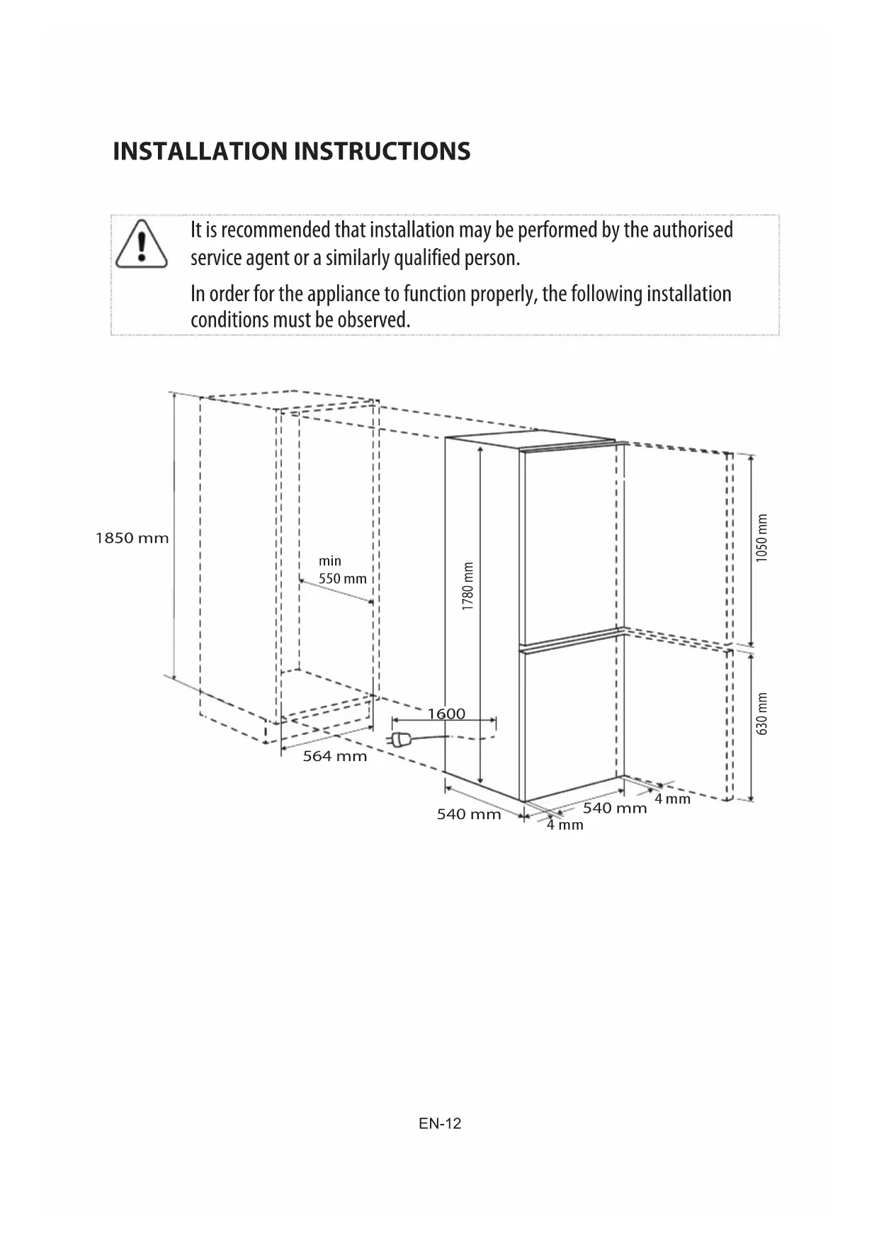 EN-2" EN-3EN-4EN-5EN-6EN-7EN-8EN-9EN-10EN-11It is recommended that installation may be performed by the authorised service agent or a similarly qualified person. In order for the appliance to function properly, the following installation conditions must be observed. 1850mm min 550 mm