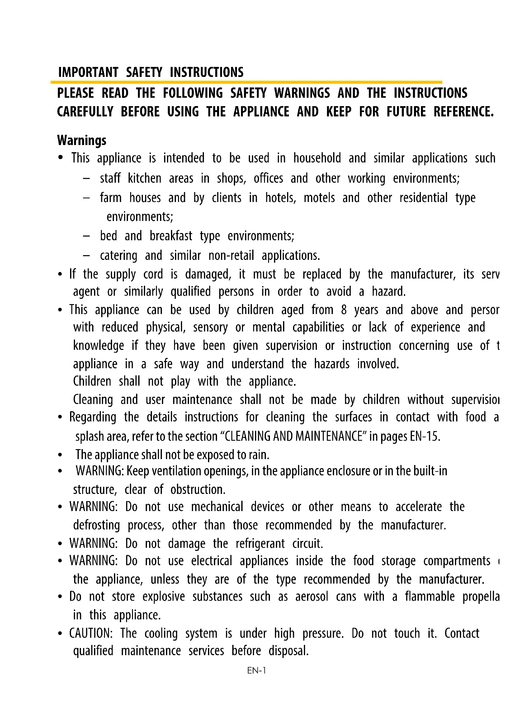 the appliance, unless they are of the type recommended by the manufacturer. Do not store explosive substances such as aerosol cans with a flammable propellant in this appliance. CAUTION: The cooling system is under high pressure. Do not touch it. Contact qualified maintenance services before disposal. EN-1 splash area, refer to the section “CLEANING AND MAINTENANCE” in pages EN-15. The appliance shall not be exposed to rain. INSTALLATION: DO NOT INSTALLTHIS APPLIANC E IN AREAS THAT ARE TOO HUMID OR TOO COLD, SUCH AS THE OUTBUILDINGS, GARAGES OR WINE CELLARS. For disposal of the appliance: To prevent possible harm to the environment or human health from uncontrolled waste disposal, recycle the appliance responsibly to promote the sustainable reuse of material resources, the refrigerants and the flammable insulation blowing gases. The disposal should only be done through public c ol lection points; contact the waste treatment centre nearest your home for more details on the correct procedures for disposal. For installation, servicing: Appliance should be placed on a horizontal surface and keep t he ventilation freely. Don’t try to replace or repair any components by yourself, ask the ser vice agency for help if necessary. For handling: Always handle the appliance to avoid any damage.