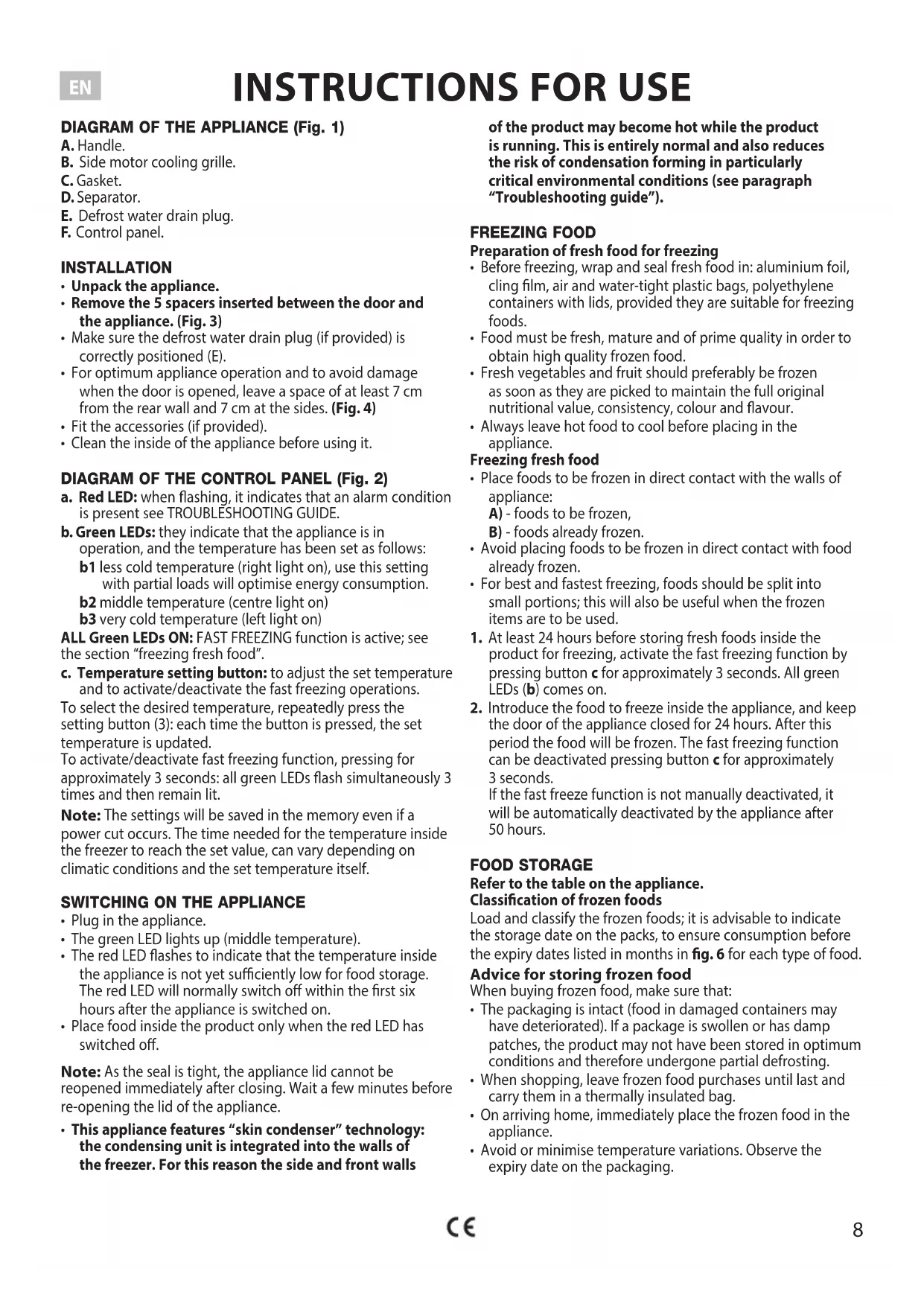 - This appliance features “skin condenser” technology: the condensing unit is integrated into the walls of the freezer. For this reason the side and front walls of the product may become hot while the product is running. This is entirely normal and also reduces the risk of condensation forming in particularly critical environmental conditions (see paragraph “Troubleshooting guide”). FREEZING FOOD Preparation of fresh food for freezing
