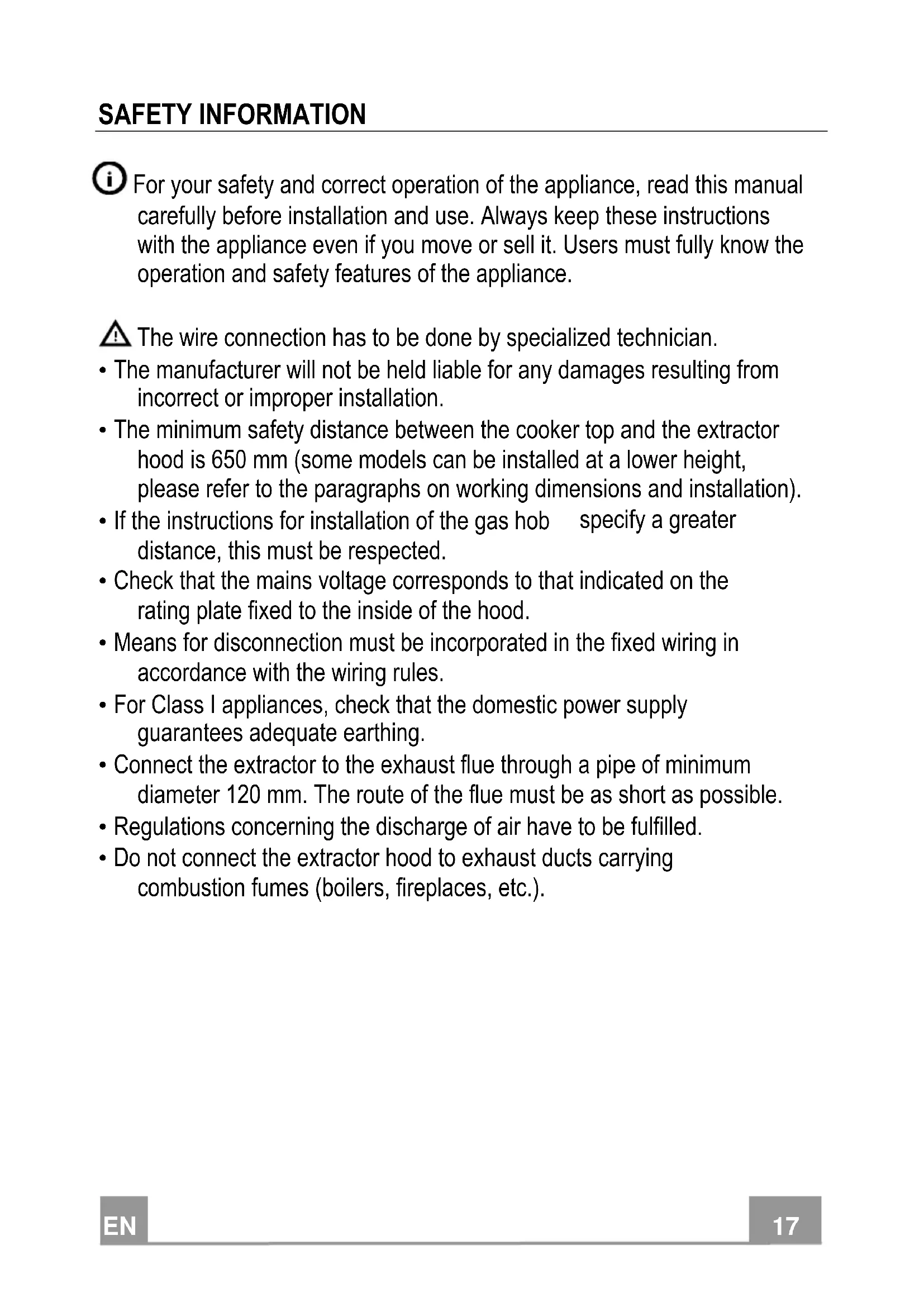 - Do not connect the extractor hood to exhaust ducts carrying combustion fumes (boilers, fireplaces, etc.).EN