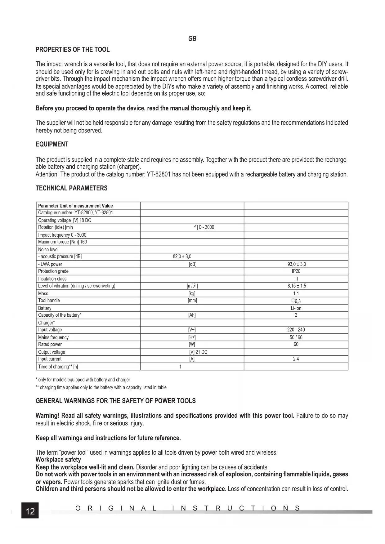 The impact wrench is a versatile tool, that does not require an external power source, it is portable, designed for the DIY users. It should be used only for is crewing in and out bolts and nuts with left-hand and right-handed thread, by using a variety of screw- driver bits. Through the impact mechanism the impact wrench off ers much higher torque than a typical cordless screwdriver drill. Its special advantages would be appreciated by the DIYs who make a variety of assembly and fi nishing works. A correct, reliable and safe functioning of the electric tool depends on its proper use, so: Before you proceed to operate the device, read the manual thoroughly and keep it. The supplier will not be held responsible for any damage resulting from the safety regulations and the recommendations indicated hereby not being observed. EQUIPMENT The product is supplied in a complete state and requires no assembly. Together with the product there are provided: the recharge- able battery and charging station (charger). Attention! The product of the catalog number: YT-82801 has not been equipped with a rechargeable battery and charging station. TECHNICAL PARAMETERS Parameter Unit of measurement Value Catalogue number YT-82800, YT-82801 Operating voltage [V] 18 DC Rotation (idle) [min
