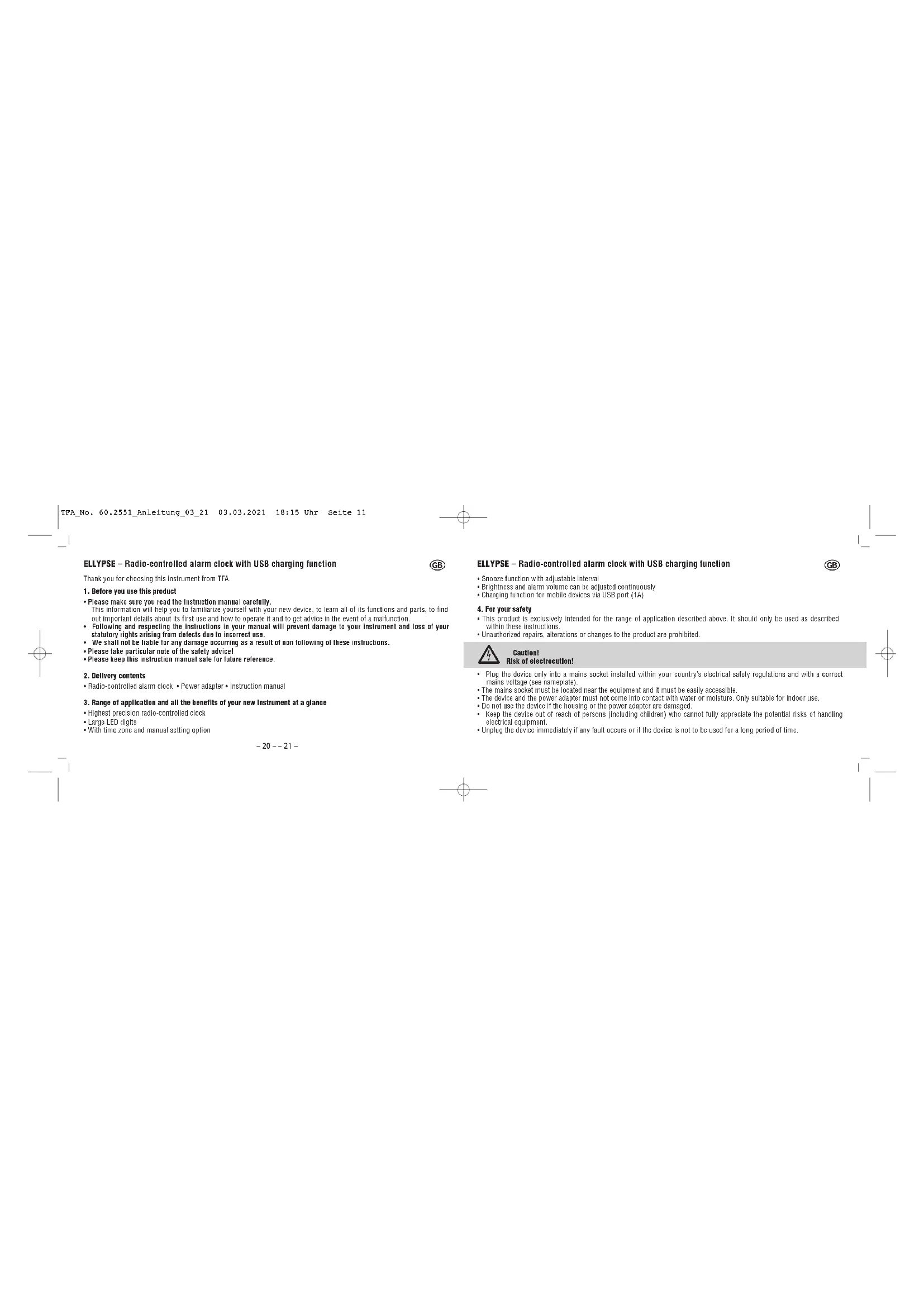 - Do not expose the device to extreme temperatures, vibrations or shocks. ELLYPSE – Radio-controlled alarm clock with USB charging function