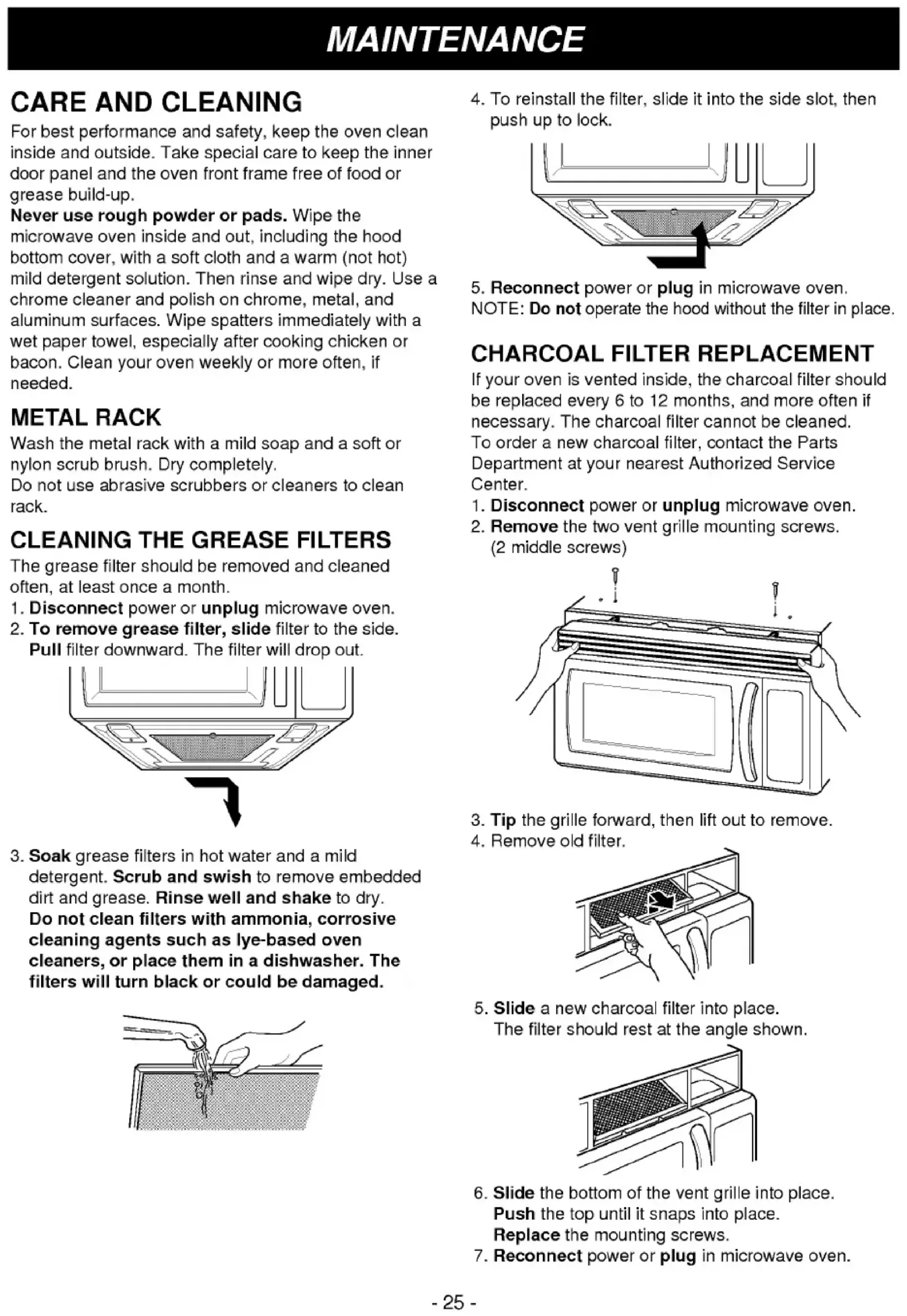 RICE-25- CARE AND CLEANING Forbest performance and safety, keep theovencleaninsideandoutside.Take special careto keep theinnerdoor panel andtheovenfrontframefreeoffoodorgrease build-up. Neveruse rough powder pads. Wipe themicrowaveoveninsideandout, including thehoodbottomcover,withasoftclothandawarm (not hot) mild detergent solution.Thenrinseand wipe dry. Useachromecleanerand polish chrome, metal, andaluminumsurfaces. Wipe spatters immediately withawetpaper towel, especially after cooking chickenorbacon.Cleanyouroven weekly ormore often, ifneeded. METAL RACK Washthemetalrackwithamildsoapandasoftor nylon scrubbrush. Dry completely. Donotuseabrasivescrubbersorcleanerstocleanrack. CLEANING THE GREASE FILTERS Thegreasefiltershouldberemovedandcleaned often, atleastonceamonth. Disconnectpoweror unplug microwaveoven. Toremovegrease filter, slidefiltertotheside.Pullfilterdownward.Thefilterwill drop out. Soakgreasefiltersinhotwaterandamild detergent. Scrubandswishtoremoveembeddeddirtandgrease.Rinsewelland shaketo dry. not cleanfilterswith ammonia, corrosive cleaning agents suchas lye-based oven cleaners, place theminadishwasher.Thefilterswill turn blackorcouldbe damaged. CHARCOAL FILTER REPLACEMENT Ifyourovenisvented inside, thecharcoalfiltershouldbe replaced every