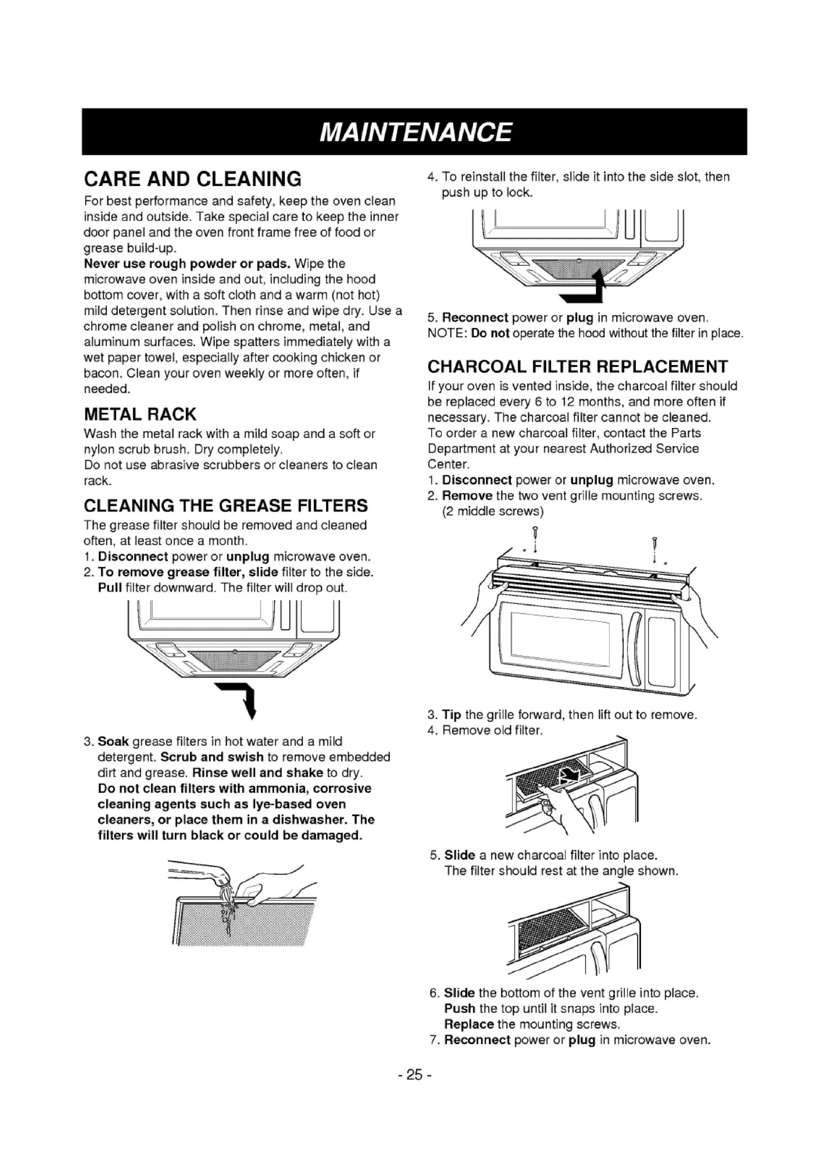 RICE-25- CARE AND CLEANING Forbest performance and safety, keep theovencleaninsideandoutside.Take special careto keep theinnerdoor panel andtheovenfrontframefreeoffoodorgrease build-up. Neveruse rough powder pads. Wipe themicrowaveoveninsideandout, including thehoodbottomcover,withasoftclothandawarm (not hot) mild detergent solution.Thenrinseand wipe dry. Useachromecleanerand polish chrome, metal, andaluminumsurfaces. Wipe spatters immediately withawetpaper towel, especially after cooking chickenorbacon.Cleanyouroven weekly ormore often, ifneeded. METAL RACK Washthemetalrackwithamildsoapandasoftor nylon scrubbrush. Dry completely. Donotuseabrasivescrubbersorcleanerstocleanrack. CLEANING THE GREASE FILTERS Thegreasefiltershouldberemovedandcleaned often, atleastonceamonth. Disconnectpoweror unplug microwaveoven. Toremovegrease filter, slidefiltertotheside.Pullfilterdownward.Thefilterwill drop out. Soakgreasefiltersinhotwaterandamild detergent. Scrubandswishtoremoveembeddeddirtandgrease.Rinsewelland shaketo dry. not cleanfilterswith ammonia, corrosive cleaning agents suchas lye-based oven cleaners, place theminadishwasher.Thefilterswill turn blackorcouldbe damaged. CHARCOAL FILTER REPLACEMENT Ifyourovenisvented inside, thecharcoalfiltershouldbe replaced every