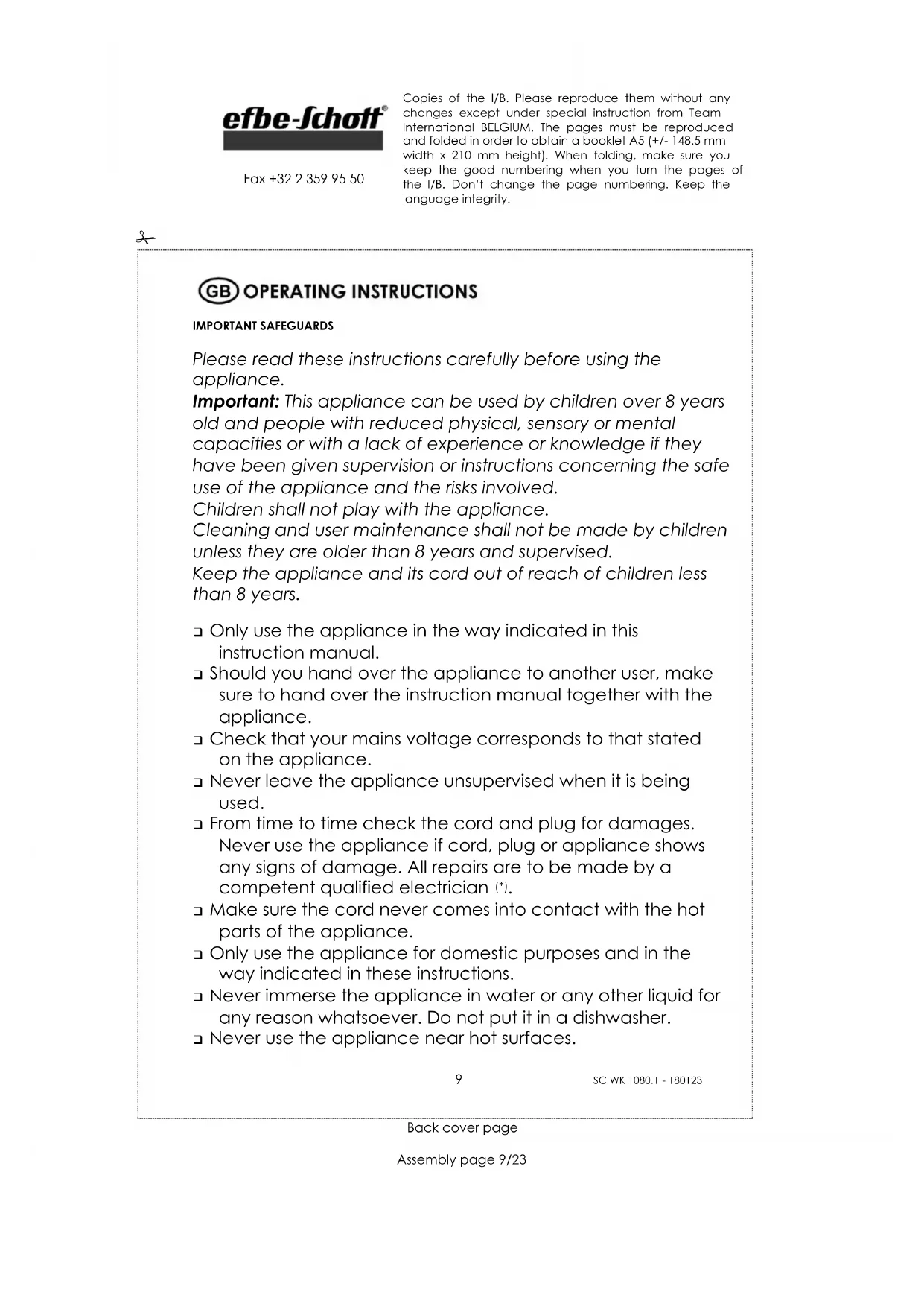 Make sure the cord never comes into contact with the hot parts of the appliance. Only use the appliance for domestic purposes and in the way indicated in these instructions. Never immerse the appliance in water or any other liquid for any reason whatsoever. Do not put it in a dishwasher. Never use the appliance near hot surfaces. Copies of the I/B. Please reproduce them without any changes except under special instruction from Team International BELGIUM. The pages must be reproduced and folded in order to obtain a booklet A5 (+/- 148.5 mm width x 210 mm height). When folding, make sure you keep the good numbering when you turn the pages of the I/B. Don’t change the page numbering. Keep the language integrity. 10 SC WK 1080.1 - 180123