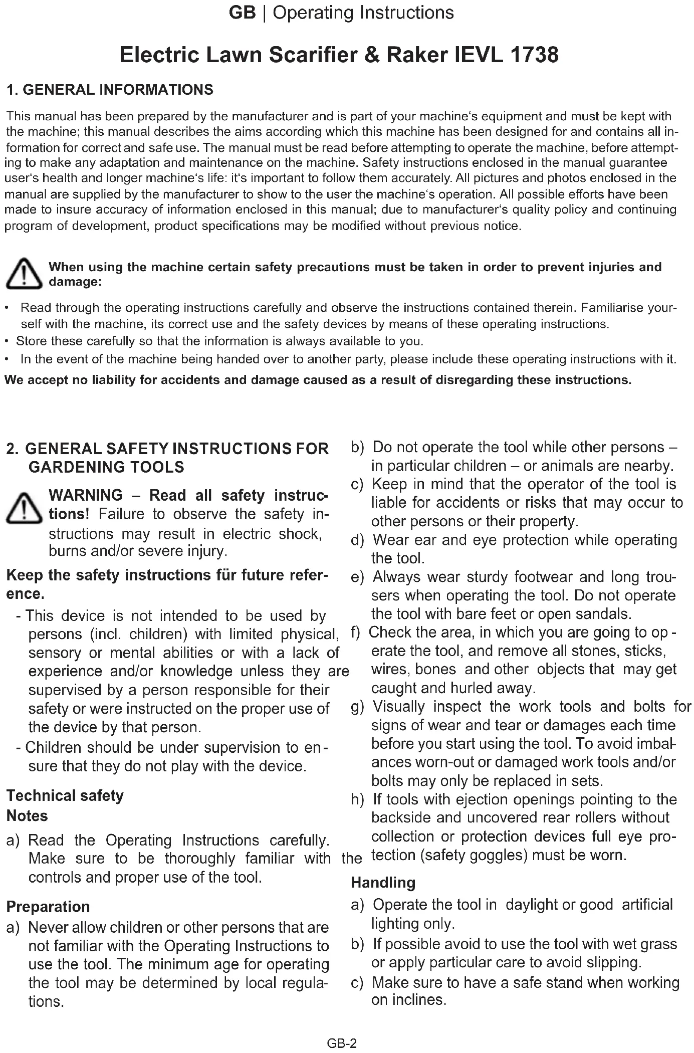 - By scarifying you remove the hardened surface, grass felt and at-growing weeds and the crusted over grass- roots are loosened up. The lawn will start to breath again and assimilate the nourishing substances, oxy- gen and water. This also prevents the establishing of bacteria in the lawn felt during the wintertime.GB-9 GB | Operating Instructions