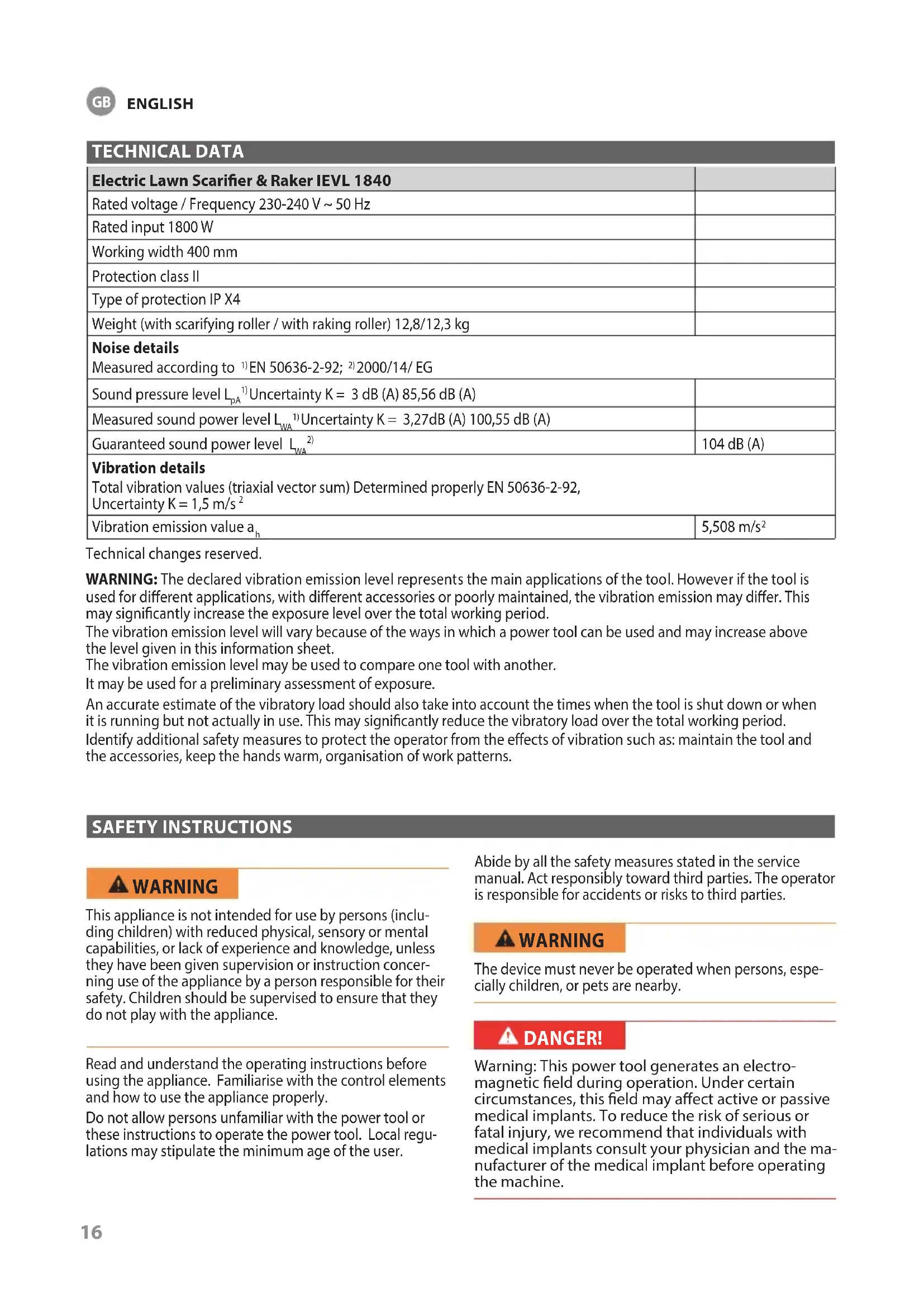 DEUTSCH16 TECHNICAL DATA Electric Lawn Scarier & Raker IEVL 1840 Rated voltage / Frequency 230-240 V ~ 50 Hz Rated input 1800 W Working width 400 mm Protection class II Type of protection IP X4 Weight (with scarifying roller / with raking roller) 12,8/12,3 kg Noise details Measured according to