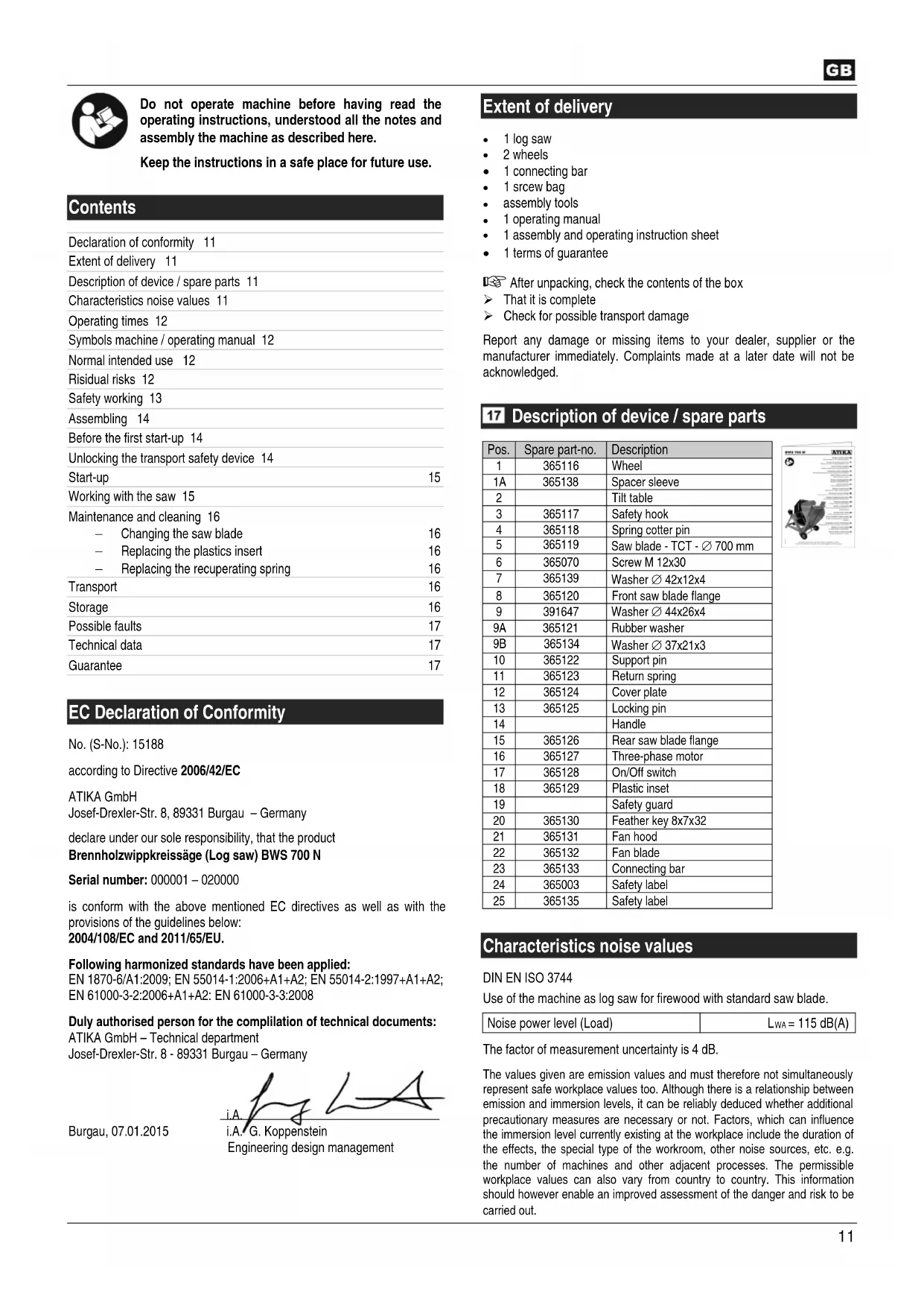 EC Declaration of Conformity No. (S-No.): 15188 according to Directive 2006/42/EC ATIKA GmbH Josef-Drexler-Str. 8, 89331 Burgau – Germany declare under our sole responsibility, that the product Brennholzwippkreissäge (Log saw) BWS 700 N Serial number: 000001 – 020000 is conform with the above mentioned EC directives as well as with the provisions of the guidelines below: 2004/108/EC and 2011/65/EU. Following harmonized standards have been applied: EN 1870-6/A1:2009; EN 55014-1:2006+A1+A2; EN 55014-2:1997+A1+A2; EN 61000-3-2:2006+A1+A2: EN 61000-3-3:2008 Duly authorised person for the complilation of technical documents: ATIKA GmbH – Technical department Josef-Drexler-Str. 8 - 89331 Burgau – Germany