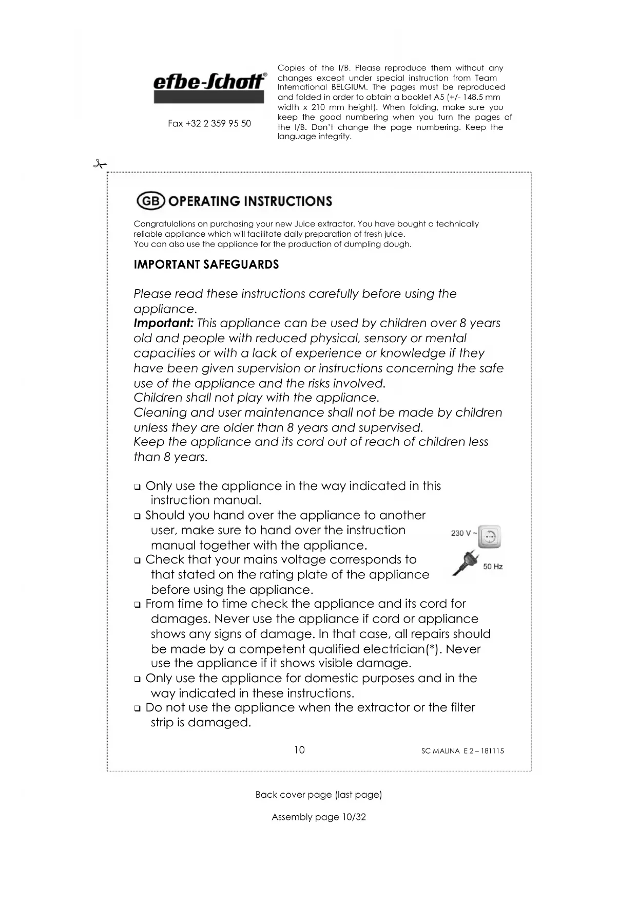 Art.-Nr. SC MALINA E 2 230V~ 350 W Copies of the I/B. Please reproduce them without any changes except under special instruction from Team International BELGIUM. The pages must be reproduced and folded in order to obtain a booklet A5 (+/- 148.5 mm width x 210 mm height). When folding, make sure you keep the good numbering when you turn the pages of the I/B. Don’t change the page numbering. Keep the language integrity.
