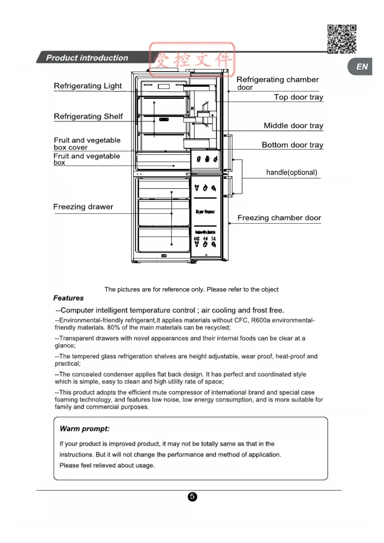 handle(optional) EN6 Handling and placement During handling, the door side of the refrigerator shall not contact with the handling tools Removing the foam base is beneficial for bottom heat dissipation and can avoid fire. The refrigerator shall be placed in an environment which is dry, has good ventilation, far from direct sunshine and heat source. The refrigerator shall be placed on the flat and firm surface. If the ground is not flat, adjust the adjusting leg to keep it level. Never place the refrigerator into a too cold environment that may get frozen. Certain space shall be left around the refrigerator, shown in the figure. >30cm >10cm >10cm EN7 Preparations prior to use