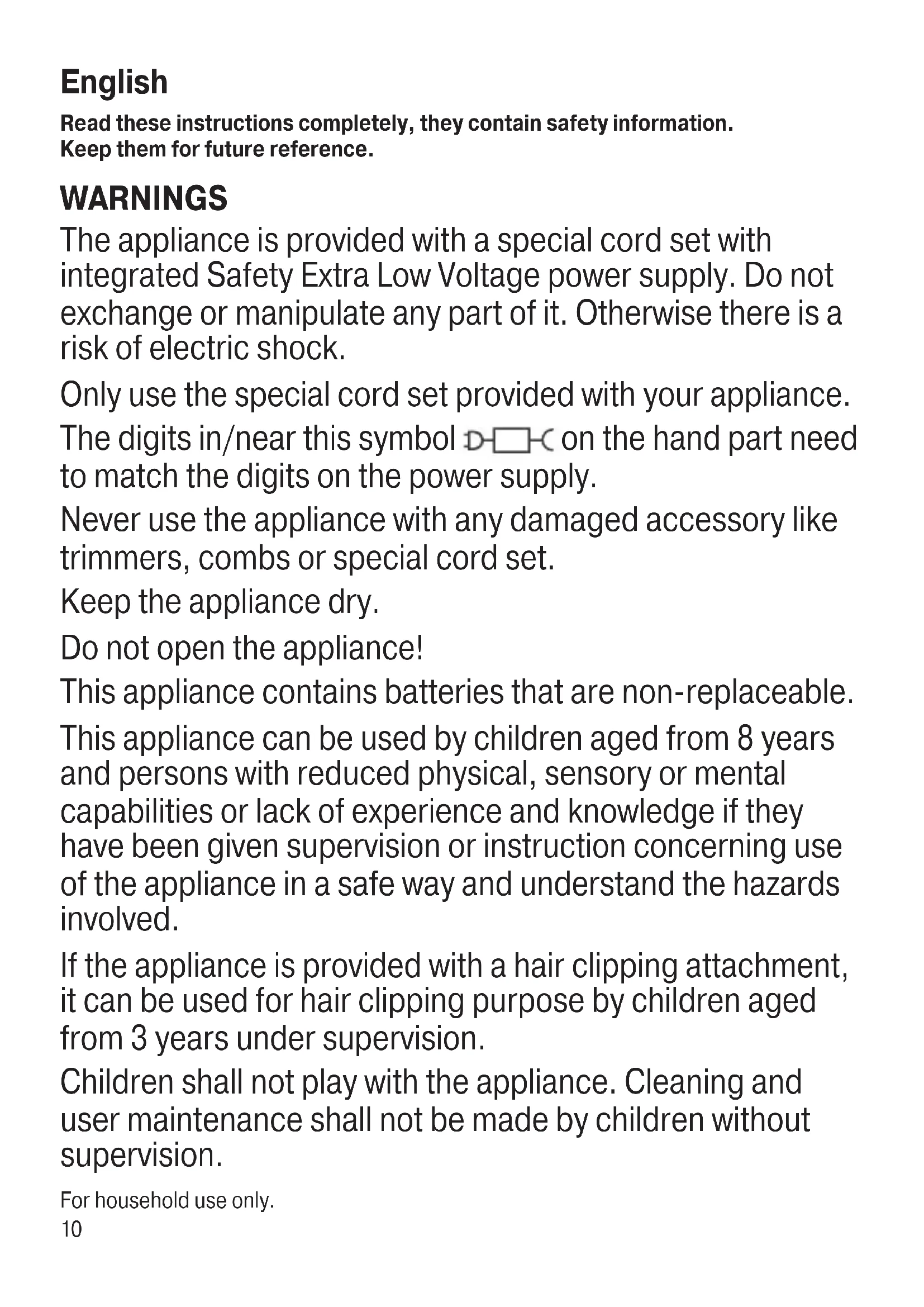 off off off oil oil 90340910_Type5516_BT3421_3420_3411_3410_3400x_CEEMEA.indd 890340910_Type5516_BT3421_3420_3411_3410_3400x_CEEMEA.indd 8 20.07.22 10:0320.07.22 10:039 oil 90340910_Type5516_BT3421_3420_3411_3410_3400x_CEEMEA.indd 990340910_Type5516_BT3421_3420_3411_3410_3400x_CEEMEA.indd 9 20.07.22 10:0320.07.22 10:0310 English Read these instructions completely, they contain safety information. Keep them for future reference. WARNINGS The appliance is provided with a special cord set with integrated Safety Extra Low Voltage power supply. Do not exchange or manipulate any part of it. Otherwise there is a risk of electric shock. Only use the special cord set provided with your appliance. The digits in/near this symbol on the hand part need to match the digits on the power supply. Never use the appliance with any damaged accessory like trimmers, combs or special cord set. Keep the appliance dry. Do not open the appliance! This appliance contains batteries that are non-replaceable. This appliance can be used by children aged from 8 years and persons with reduced physical, sensory or mental capabilities or lack of experience and knowledge if they have been given supervision or instruction concerning use of the appliance in a safe way and understand the hazards involved. If the appliance is provided with a hair clipping attachment, it can be used for hair clipping purpose by children aged from 3 years under supervision. Children shall not play with the appliance. Cleaning and user maintenance shall not be made by children without supervision. For household use only. 90340910_Type5516_BT3421_3420_3411_3410_3400x_CEEMEA.indd 1090340910_Type5516_BT3421_3420_3411_3410_3400x_CEEMEA.indd 10 20.07.22 10:0320.07.22 10:0311 Caution When charging, make sure that the appliance is switched off. Important Recommended ambient temperature for charging is 5 °C to 35 °C. The battery may not charge properly or at all under extreme low or high temperatures. Recommended ambient temperature for trimming is 15 °C to 35 °C. Do not expose the appliance to temperatures higher than 50 °C for extended periods of time. To keep the attachments working properly, oil the trimmer and the foils with a drop of light machine oil (not included) regularly. Description 1a Trimmer head*/** 1b Detailed trimmer head*/** 1c Minifoil shaver head* 2 Length selector 3 On/off button 4 Power socket 5 Power supply** 6 Charging indicator 7 Precision beard comb (0.5-10 mm)*/** 8 Precision hair comb (10.5-20 mm)*/**