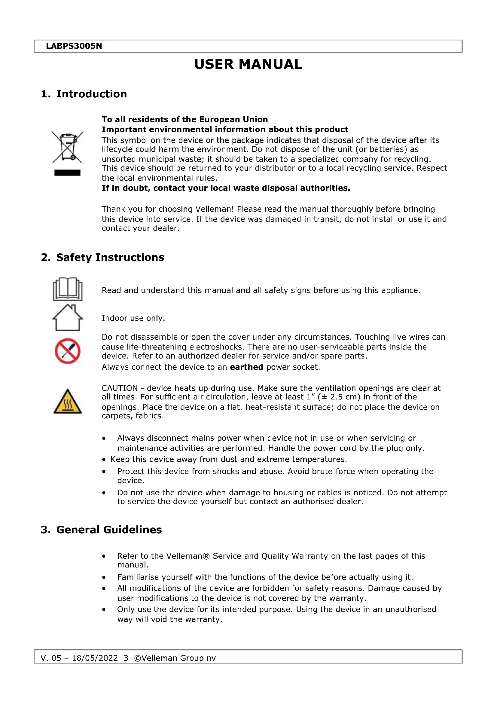 The copyright to this manual is owned by Velleman Group nv. All worldwide rights reserved. No part of this manual may be copied, reproduced, translated or reduced to any electronic medium or otherwise without the prior written consent of the copyright holder.LABPS3005N